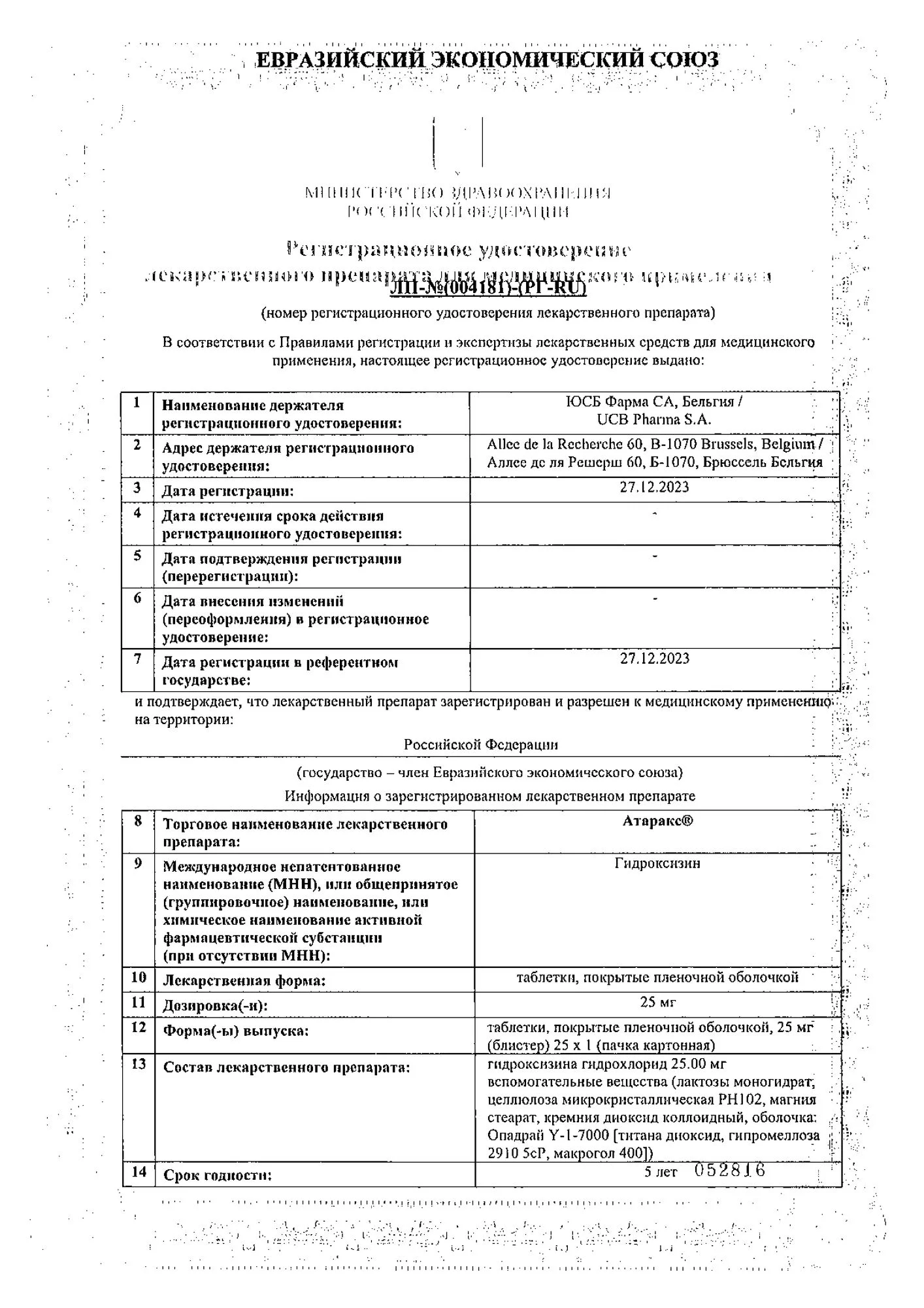 При одновременном применении Атаракс® не влияет на активность атропина, алкалоидов белладонны, сердечных гликозидов, гипотензивных средств, блокаторов гистаминовых Н2-рецепторов.