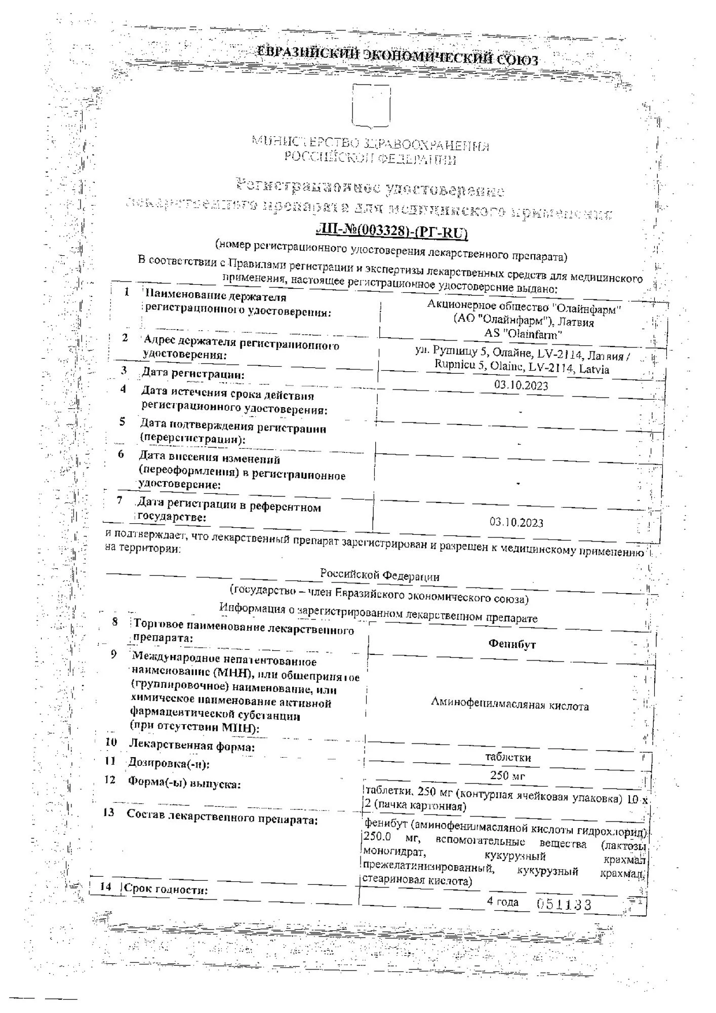 γ-амино-β-фенилбутировой кислоты гидрохлорид 250 мг