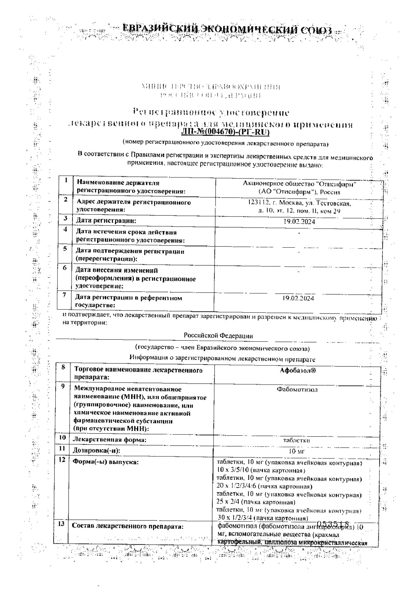 | фабомотизол (в форме дигидрохлорида) | 10 мг |