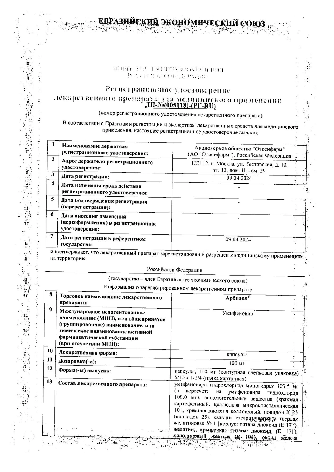 Быстро абсорбируется из ЖКТ. Сmax в плазме крови при применении умифеновира в дозе 50 мг достигается через 1.2 ч, в дозе 100 мг – 1.5 ч.