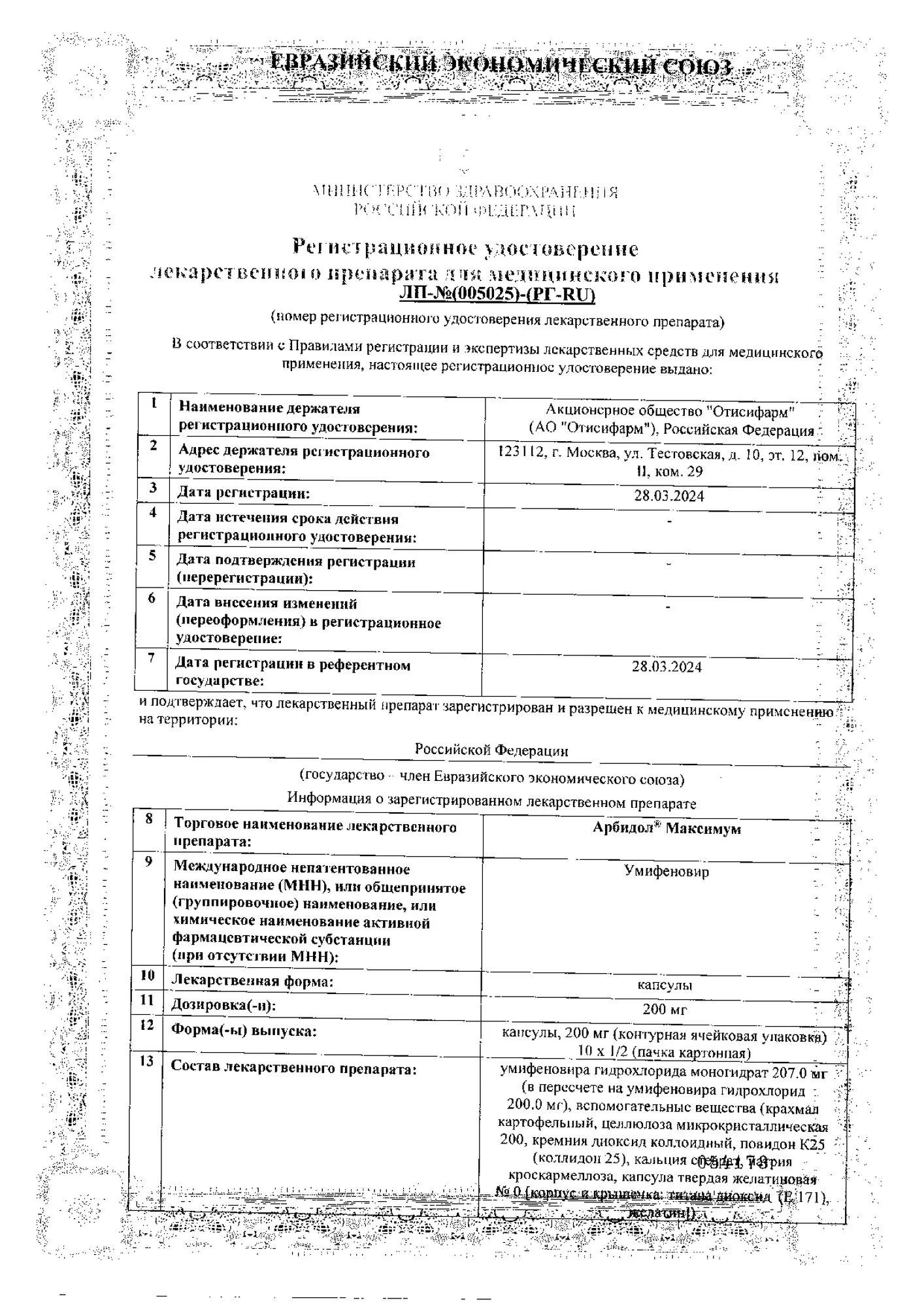 Активное вещество: умифеновира гидрохлорида моногидрат (в пересчете на умифеновира гидрохлорид) – 200 мг.