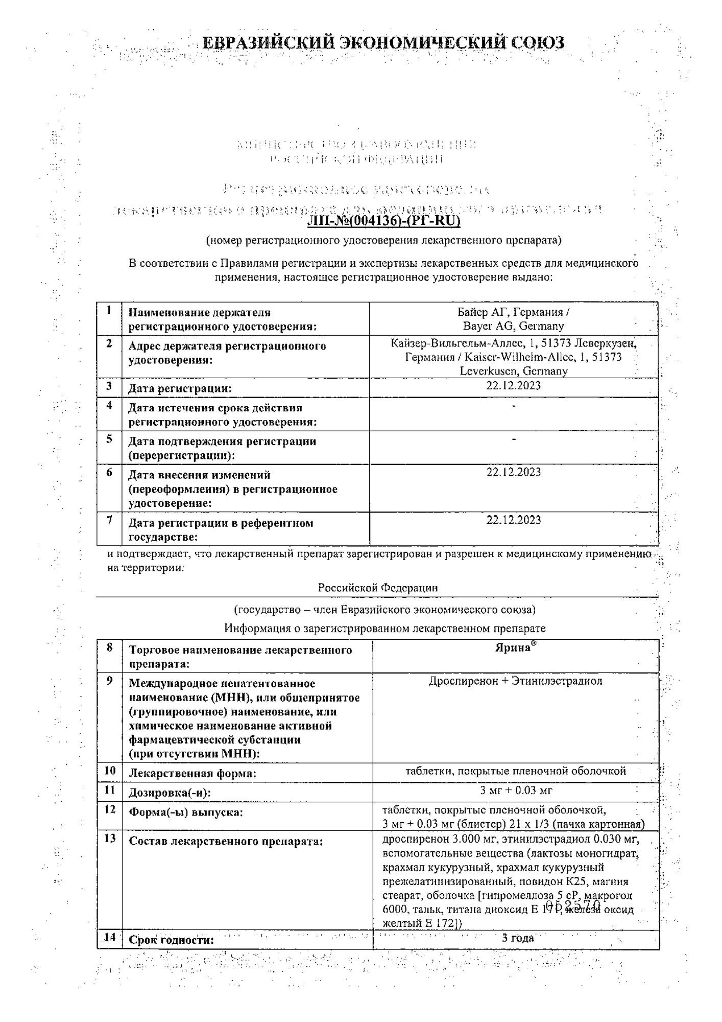 Ярина, таблетки ппо 3мг+0,03мг №21