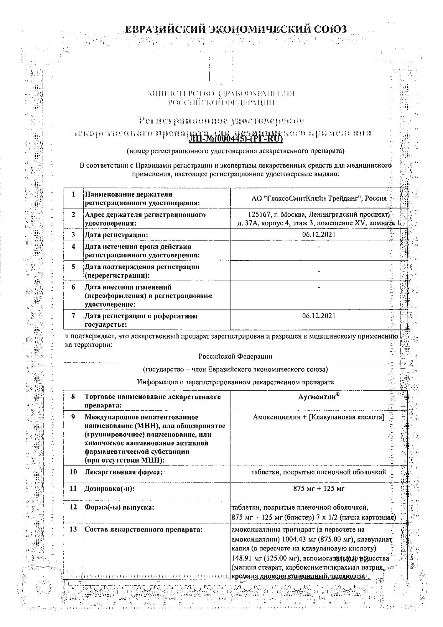 Упаковка из ламинированной алюминиевой фольги содержит пакет с осушителем, который не предназначен для приема внутрь. Необходимо использовать препарат Аугментин® в течение 30 дней с момента вскрытия упаковки из ламинированной алюминиевой фольги.