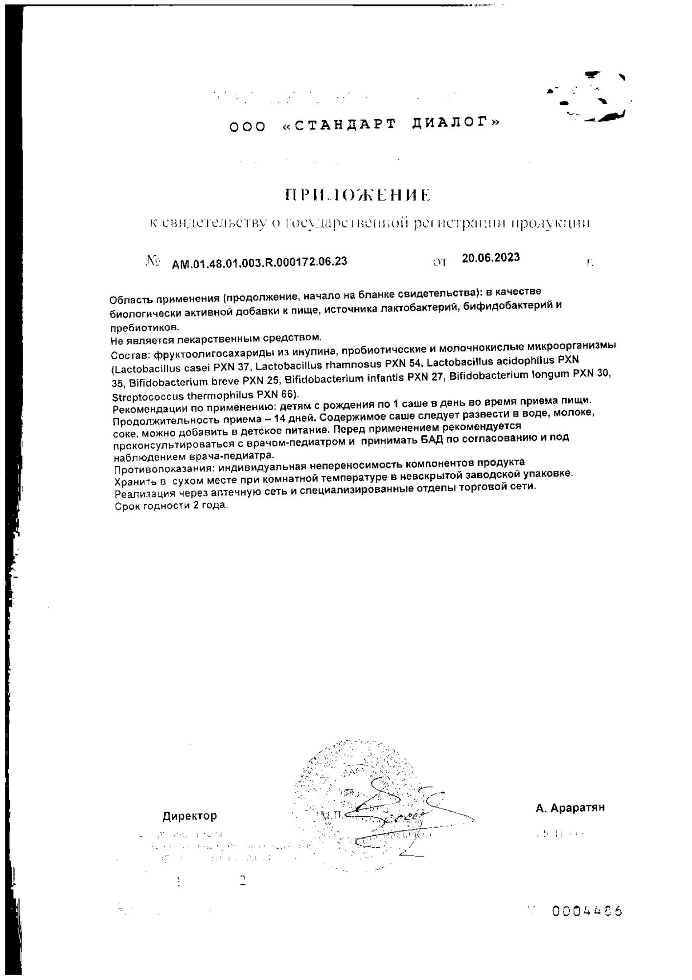 пробиотический комплекс: Lactobacillus casei PXN 37, Lactobacillus rhamnosus PXN 54, Streptococcus thermophilus PXN 66, Lactobacillus acidophilus PXN 35, Bifidobacterium breve PXN 25, Bifidobacterium infantis PXN 27, Bifidobacterium longum PXN 30, 1 миллиард (1 x 109) КОЕ/сашет