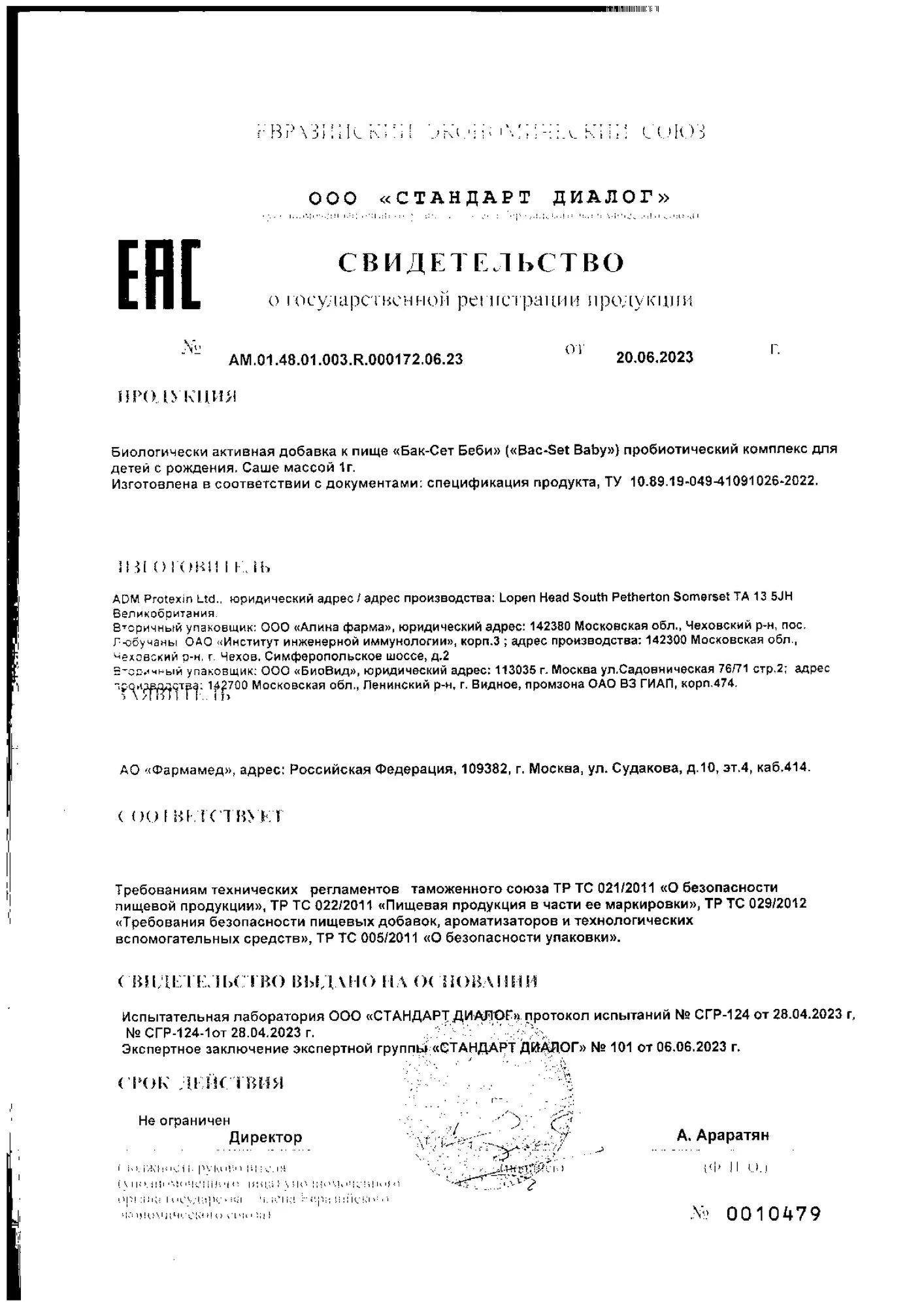 5. Качество - гарантия жизнеспособности бактерий до конца срока годности. Современная щадящая технология производства Бак-Сет беби позволяет максимально сохранить целостность и жизнеспособность бактерий, входящих в состав комплекса в течение всего срока годности препарата. Бак-Сет беби произведен в Великобритании в соответствии с международным стандартом качества фармацевтического производства компанией Probiotics International, награжденной Её Величеством Королевой Англий за достижения в области нутрицевтики.
