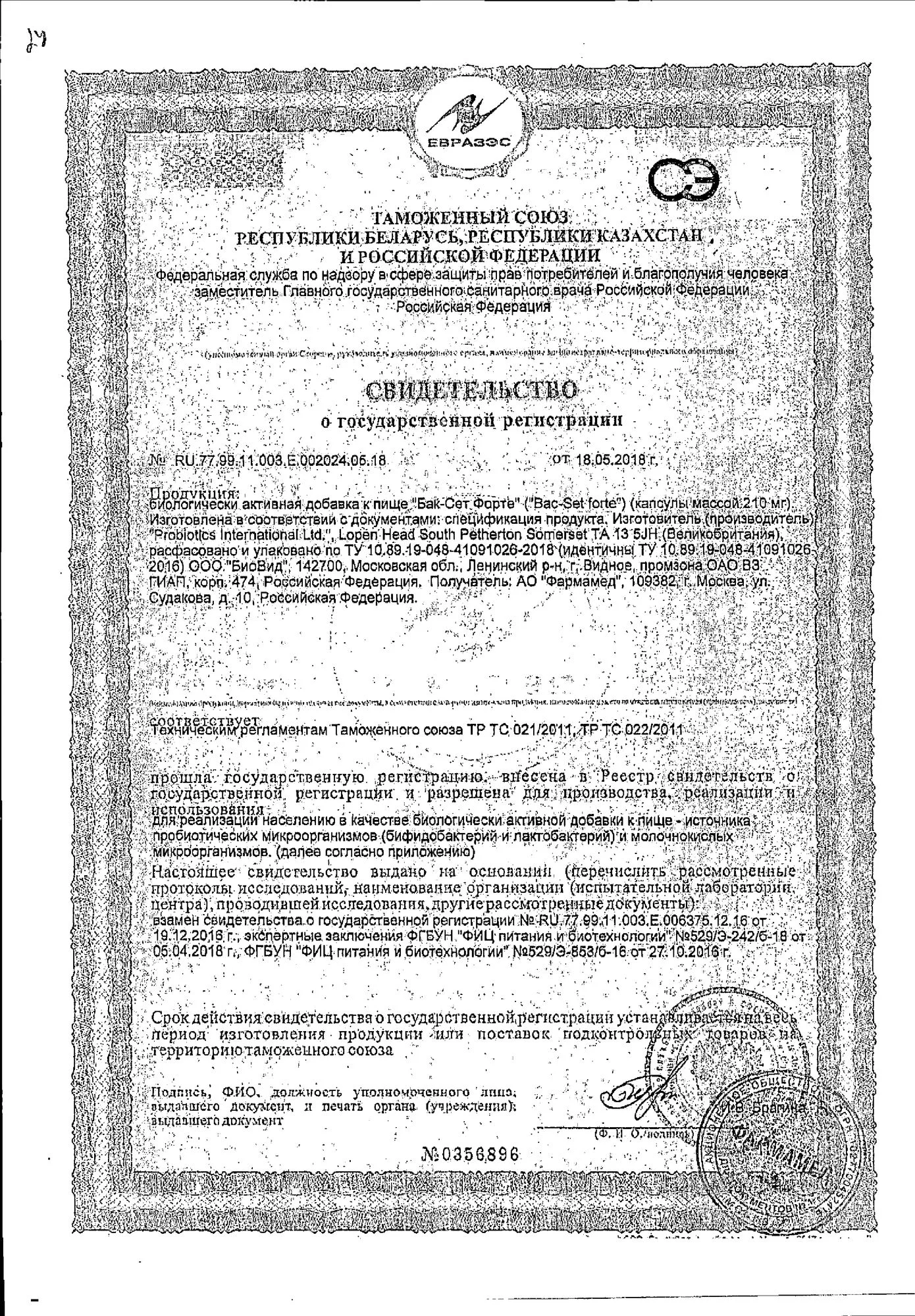 5. Качество - гарантия жизнеспособности бактерий до конца срока годности. Современная щадящая технология производства Бак-Сет форте позволяет максимально сохранить целостность и жизнеспособность бактерий, входящих в состав комплекса в течение всего срока годности препарата. Бак-Сет форте произведен в Великобритании в соответствии с международным стандартом качества фармацевтического производства компанией Probiotics International, награжденной Её Величеством Королевой Англии за достижения в области нутрицевтики.