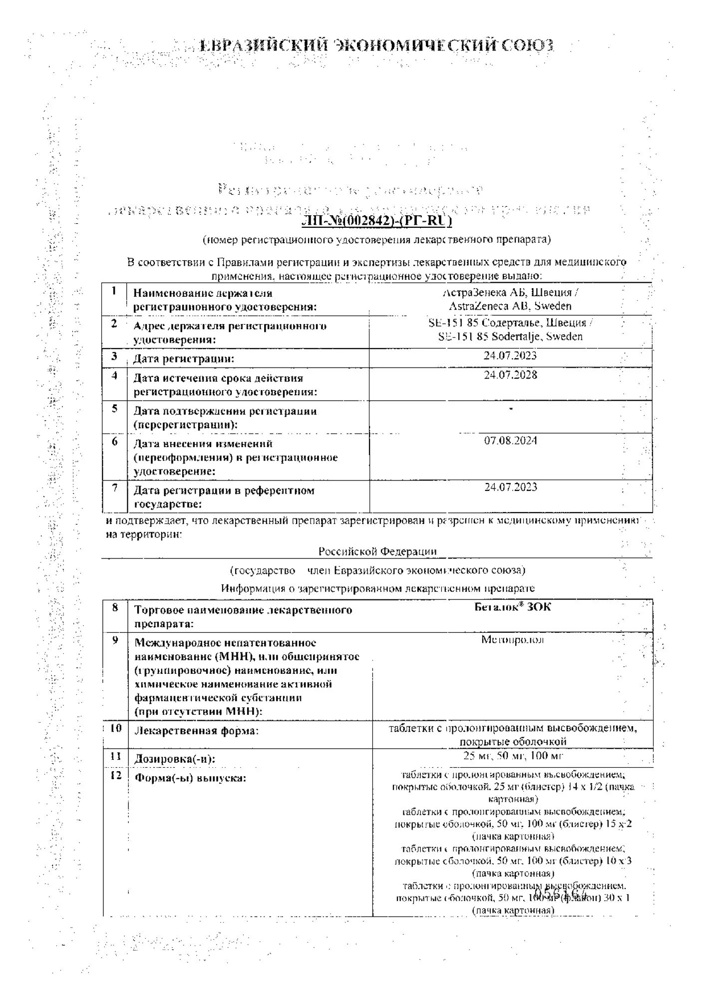 В отличие от обычных таблетированных лекарственных форм селективных бета1-адреноблокаторов (включая метопролол тартрат), при применении препарата Беталок® ЗОК наблюдается постоянная концентрация препарата в плазме крови и обеспечивается устойчивый клинический эффект (блокада бета1-адренорецепторов) в течение более 24 ч.