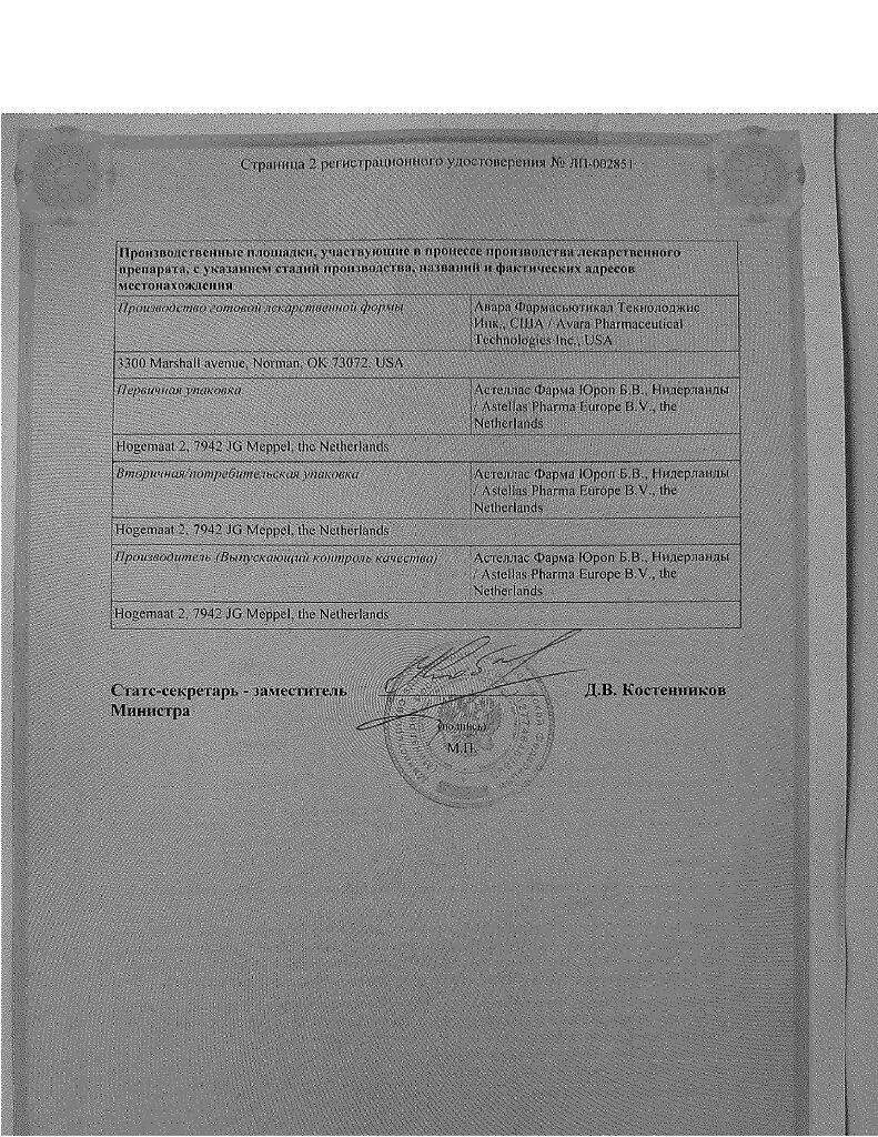 Овальная двояковыпуклая таблетка, покрытая пленочной оболочкой, желтого цвета, имеющая гравировку "355" и графическое изображение логотипа компании «Астеллас» на одной стороне, ядро белого или почти белого цвета.