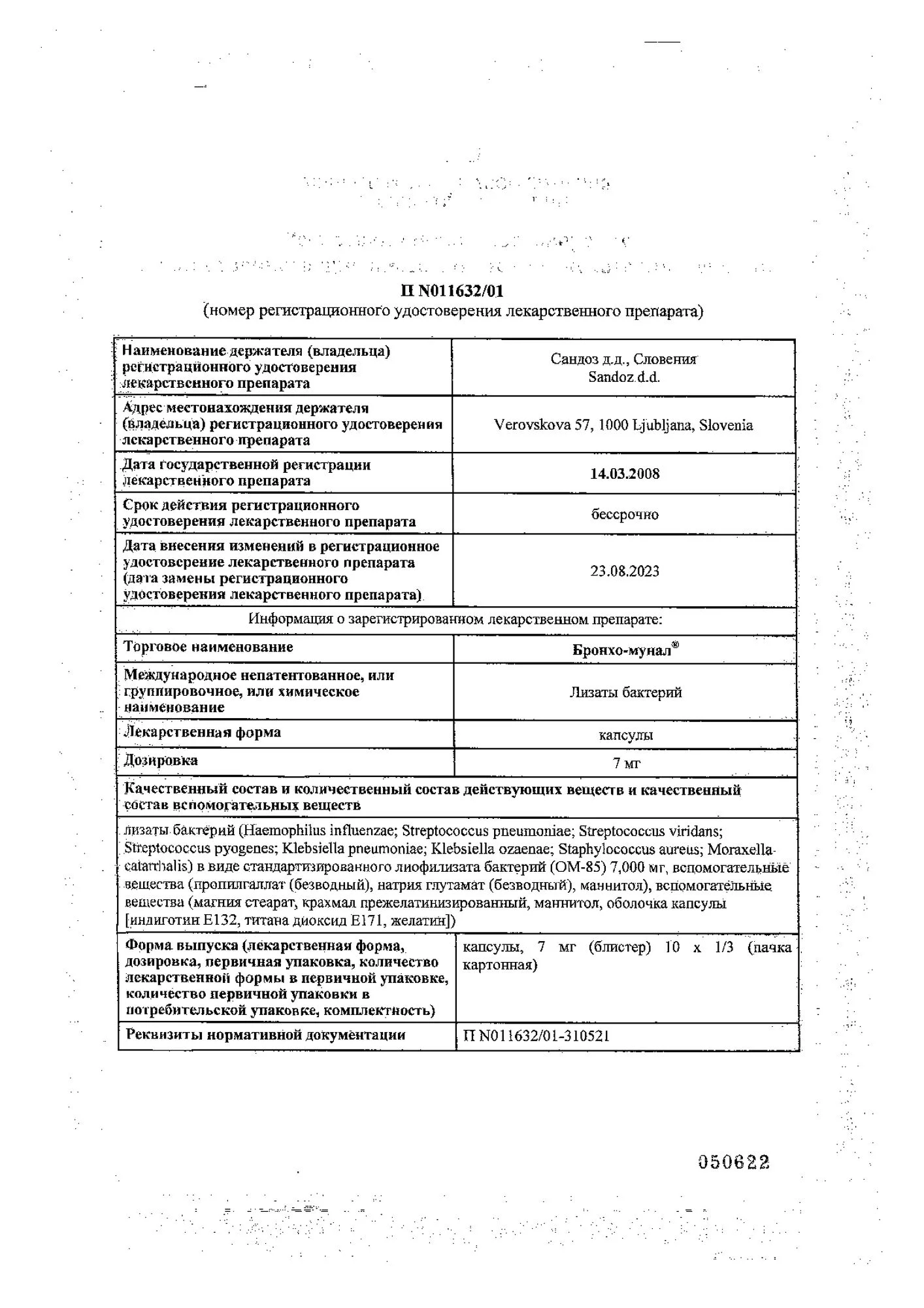 | в т.ч. лиофилизированные лизаты бактерий: Haemophilus influenzae, Streptococcus pneumoniae, Streptococcus viridans, Streptococcus pyogenes, Klebsiella pneumoniae, Klebsiella ozaenae, Staphylococcus aureus, Moraxella catarrhalis | 7 мг |