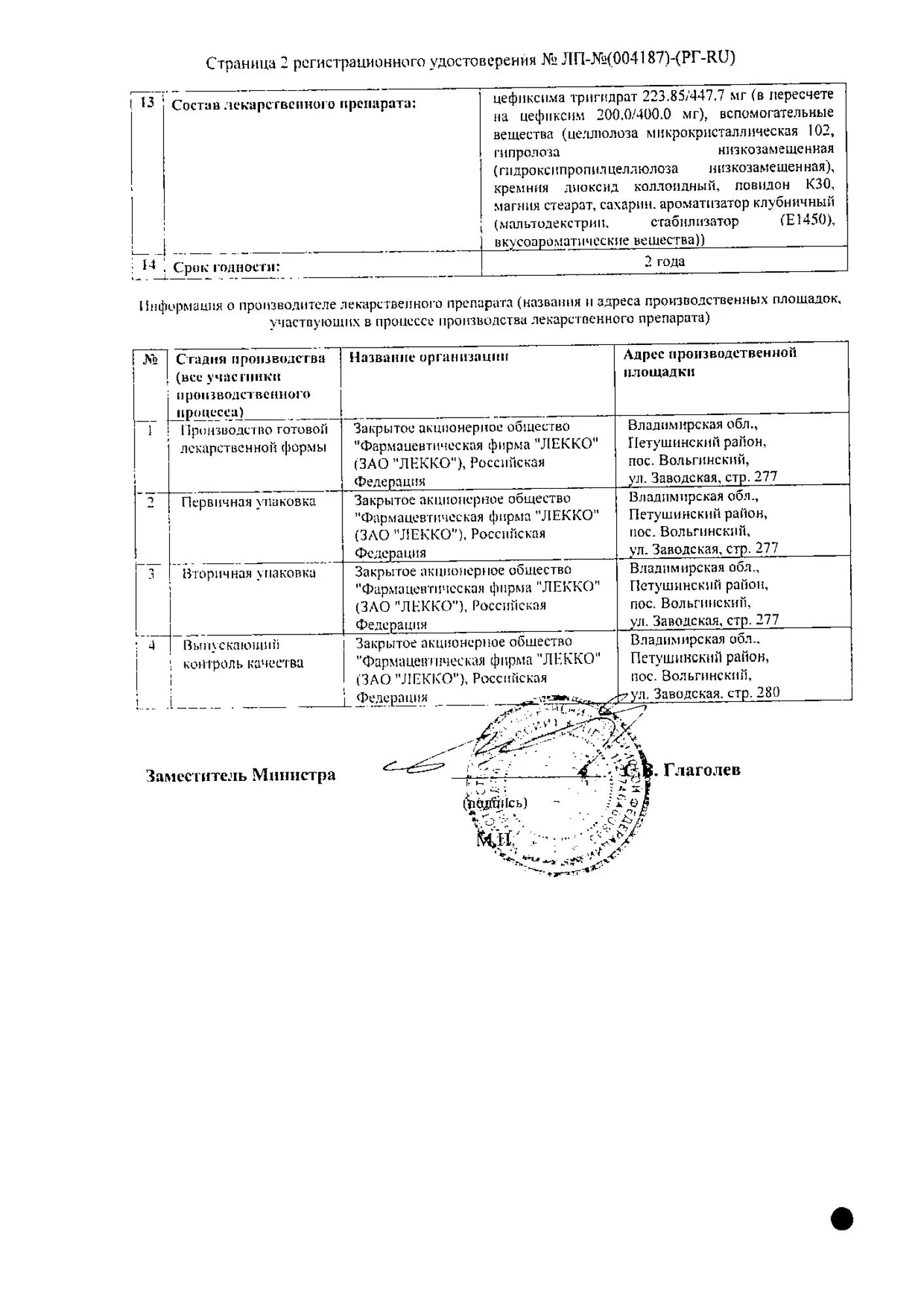 цефиксима тригидрат – 447,7 мг в пересчете на цефиксим – 400,0 мг