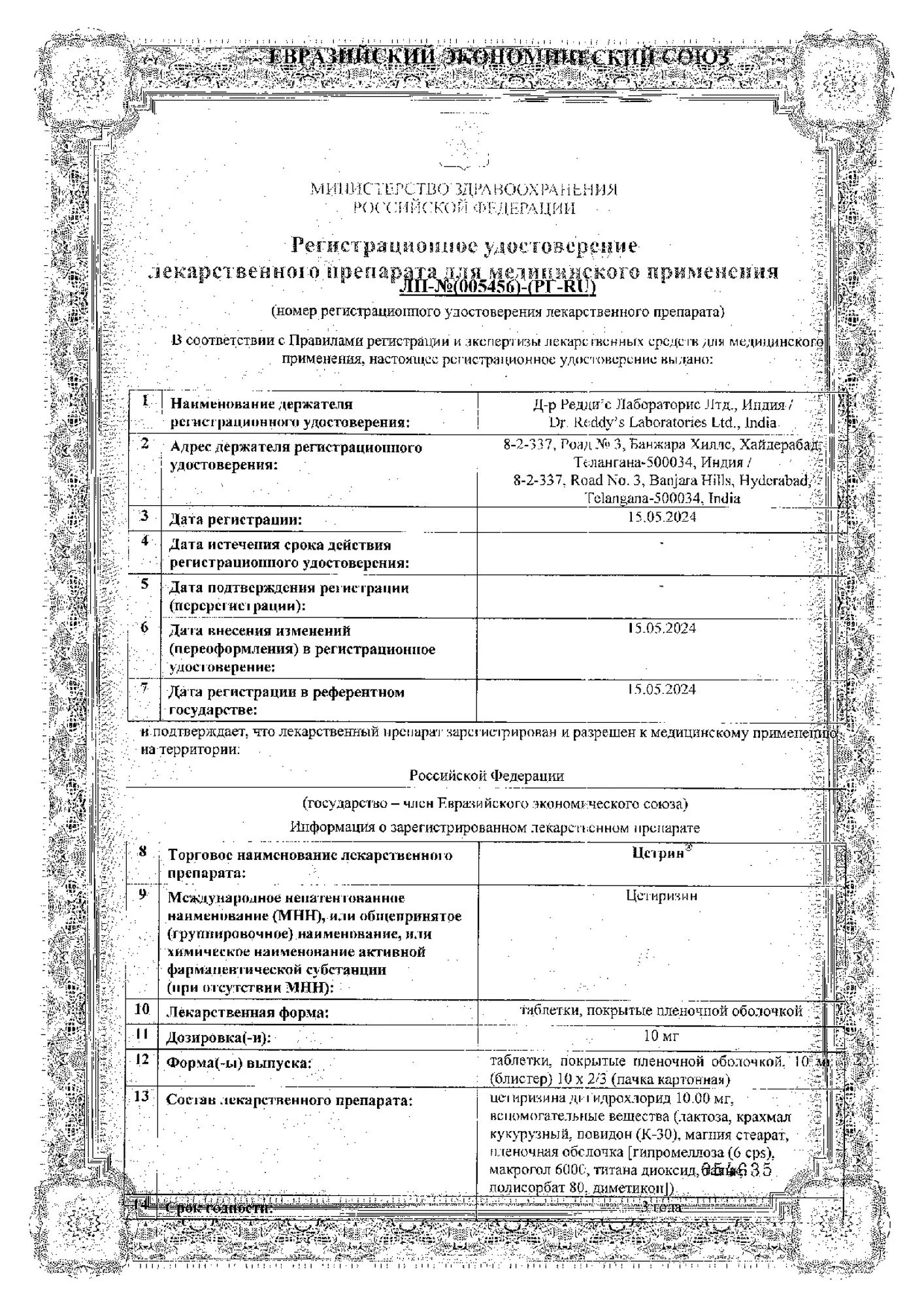 | цетиризина дигидрохлорид | 10 мг |