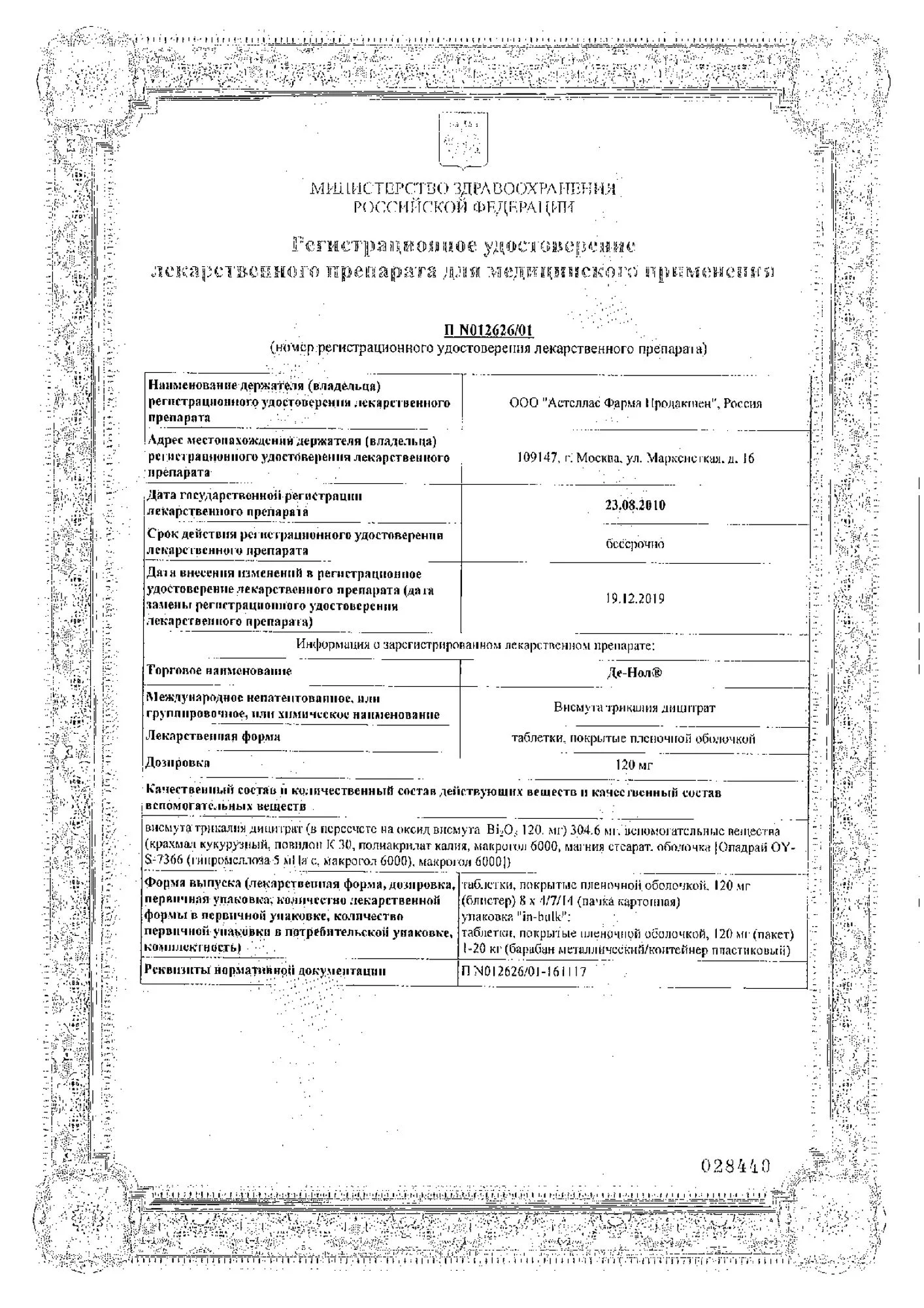 Противоязвенное средство с бактерицидной активностью в отношении Helicobacter pylori. Обладает также противовоспалительным и вяжущим действием. В кислой среде желудка образует нерастворимые висмута оксихлорид и цитрат, а также образуются хелатные соединения с белковым субстратом в виде защитной пленки на поверхности язв и эрозий. Увеличивая синтез простагландина Е, образование слизи и секрецию гидрокарбоната, стимулирует активность цитопротекторных механизмов, повышает устойчивость слизистой оболочки ЖКТ к воздействию пепсина, хлороводородной (соляной) кислоты, ферментов и солей желчных кислот. Приводит к накоплению эпидермального фактора роста в зоне дефекта. Снижает активность пепсина и пепсиногена.