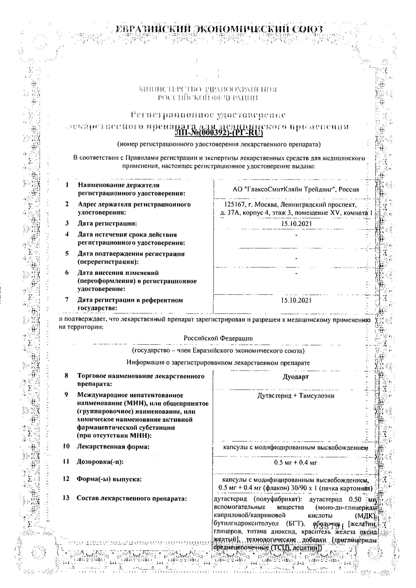 1 капсула содержит дутастерида 0,5 мг и тамсулозина гидрохлорида 0,4 мг;