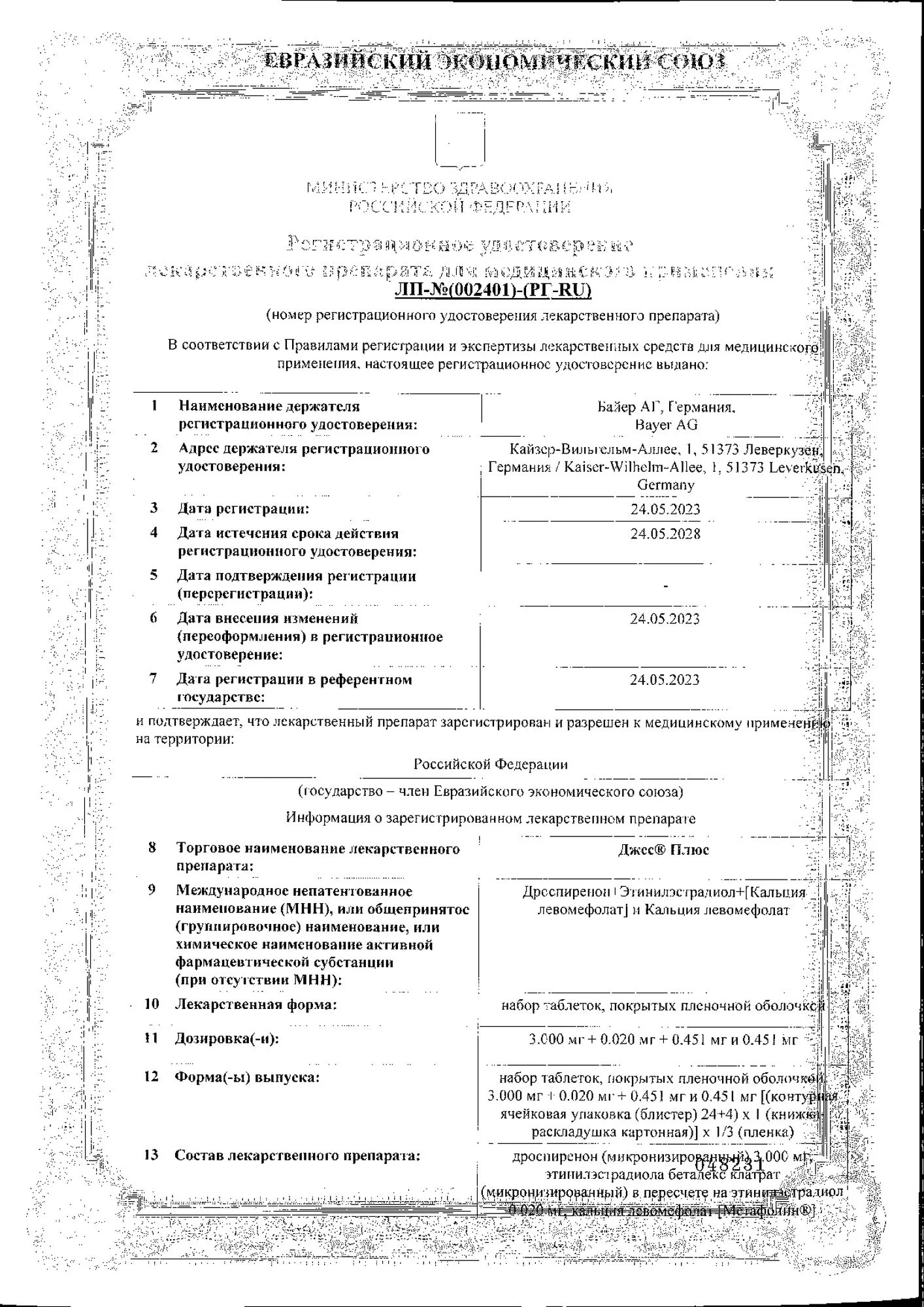Действующее вещество: Дроспиренон+Этинилэстрадиол+Кальция левомефолинат