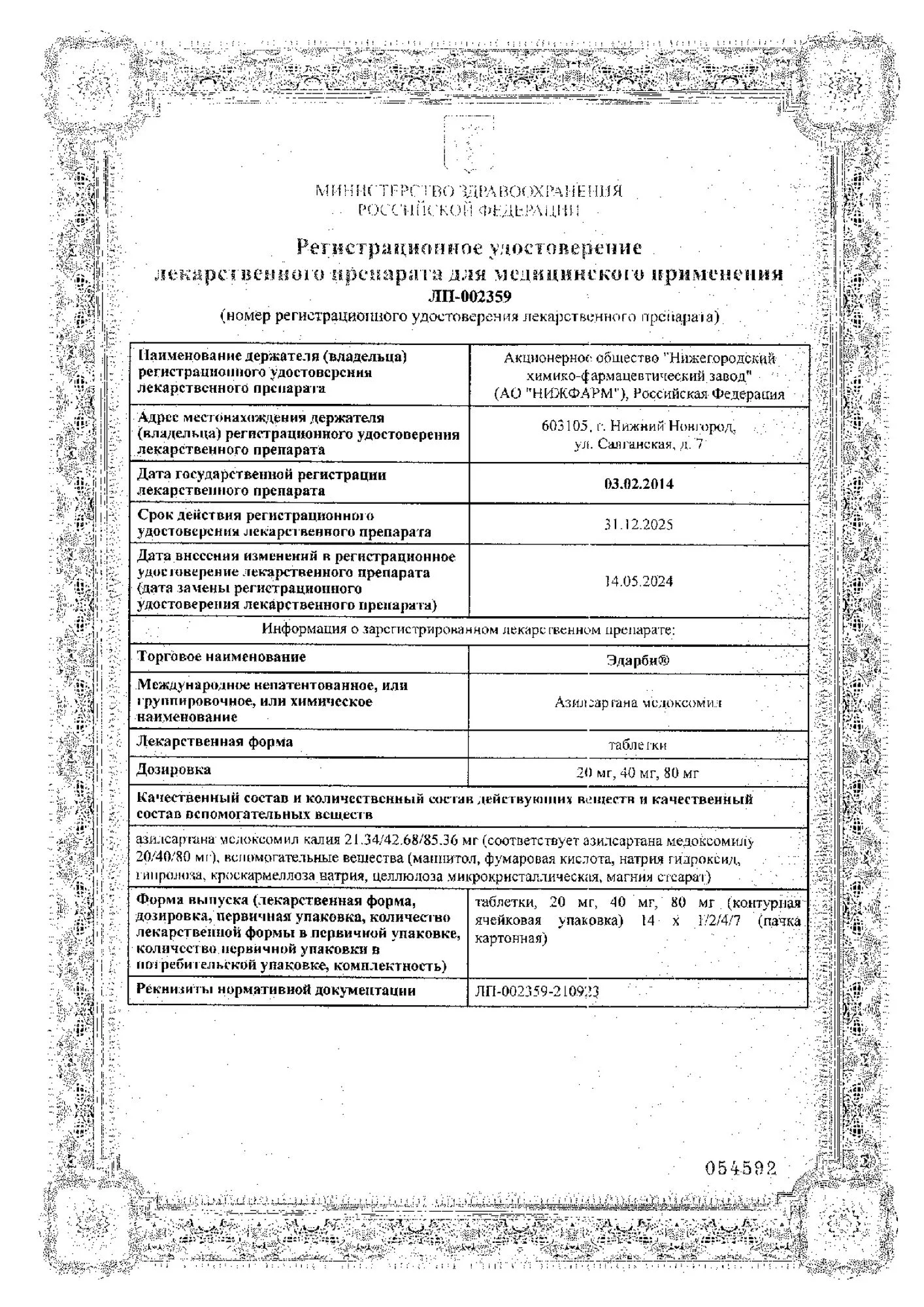 азилсартана медоксомил калия 42.68 мг, что соответствует содержанию азилсартана медоксомила 40 мг