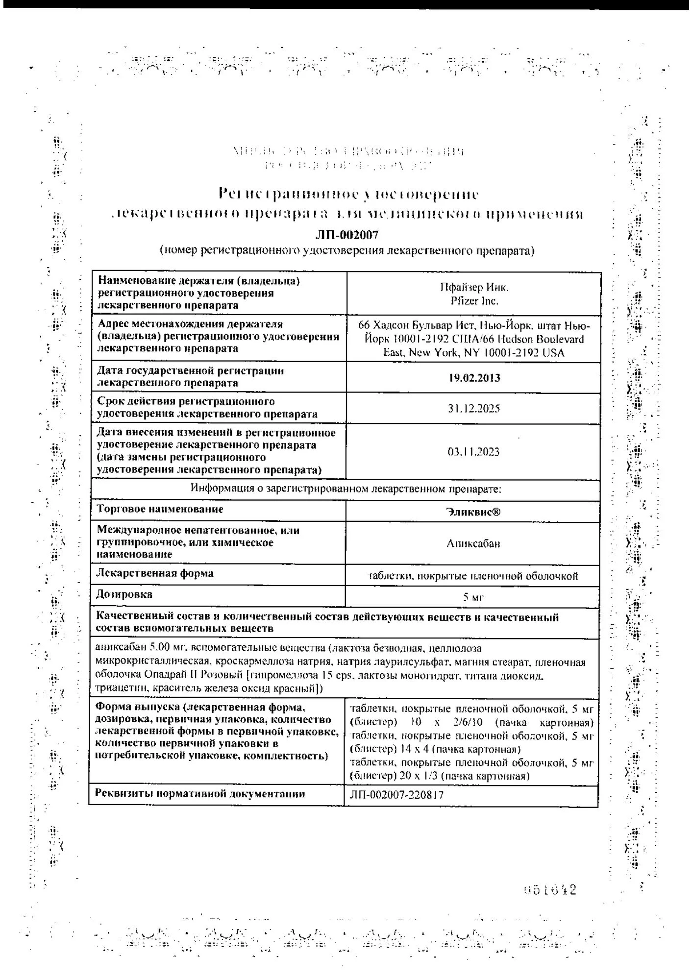 Зависимость между параметрами фармакокинетики и фармакодинамики (в том числе анти-FXa активности, MHO, протромбинового времени, АЧТВ) апиксабана и его концентрацией в плазме крови была изучена для широкого диапазона доз препарата (от 0.5 мг до 50 мг). Было показано, что зависимость между концентрацией апиксабана и активностью FXa наилучшим образом описывается с использованием линейной модели. Зависимость параметров фармакокинетики и фармакодинамики апиксабана, оценивавшаяся у пациентов, перенесших плановое эндопротезирование тазобедренного или коленного сустава, соответствовала таковой, наблюдавшейся у здоровых добровольцев.