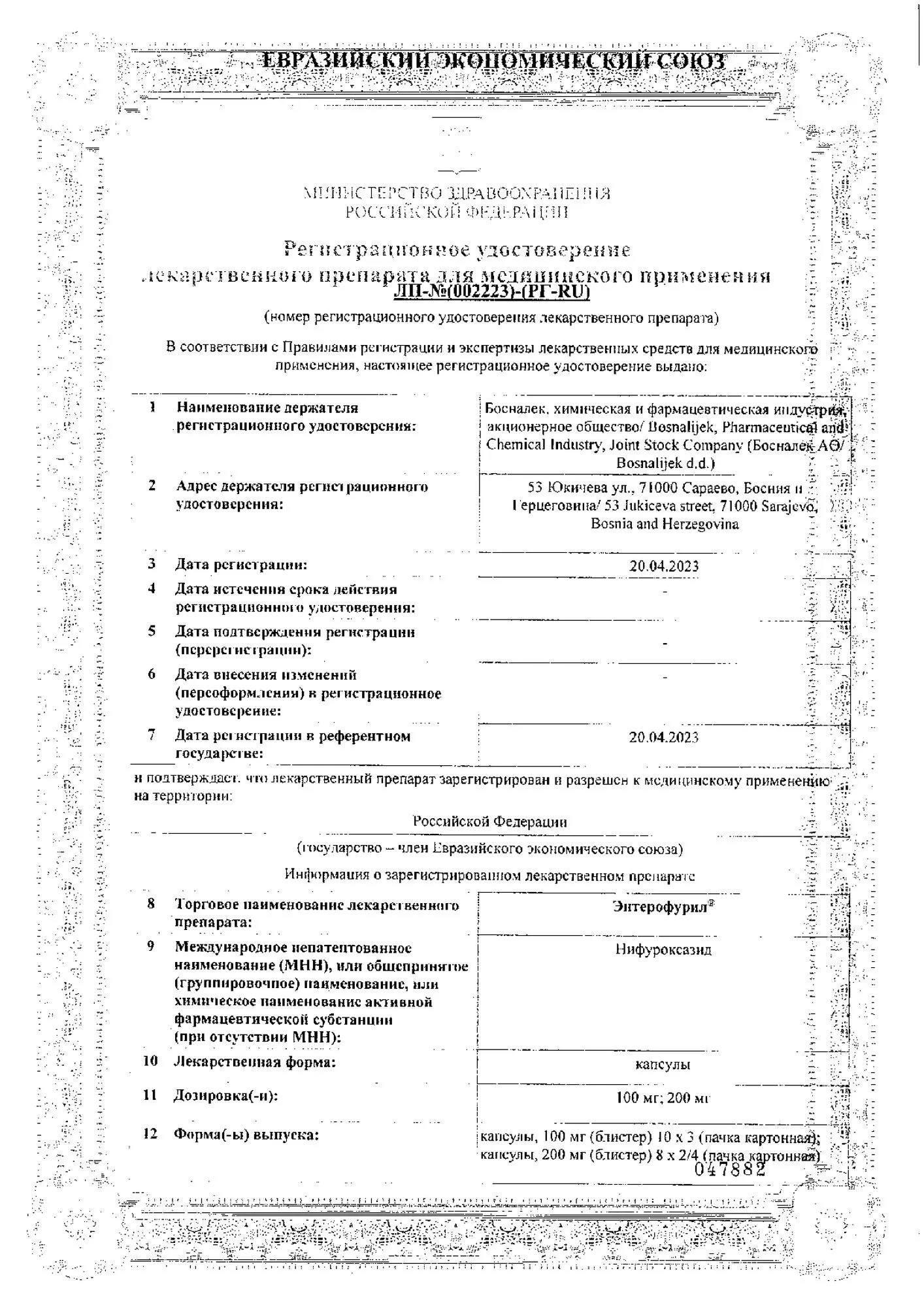 Содержание этанола в препарате Энтерофурил® суспензия составляет 1%. Минимальная разовая доза препарата, соответствующая 100 мг нифуроксазида (2.5 мл суспензии), содержит 0.02 г этанола (в пересчете на абсолютный спирт), и максимальная суточная доза, соответствующая 800 мг нифуроксазида (5 мл суспензии 4 раза в сутки), содержит 0.16 г этанола (в пересчете на абсолютный спирт).