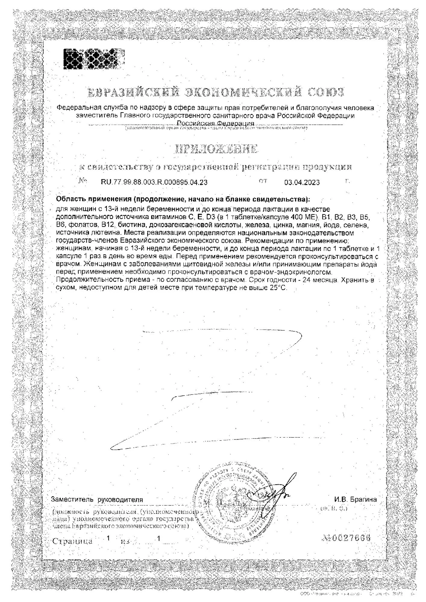 для реализации населению в качестве биологически активной добавки к пище - для женщин с 13-й недели беременности и до конца периода лактации в качестве дополнительного источника витаминов С, Е, D3, В1, В2, В3, В5, В6, фолатов, В12, биотина,