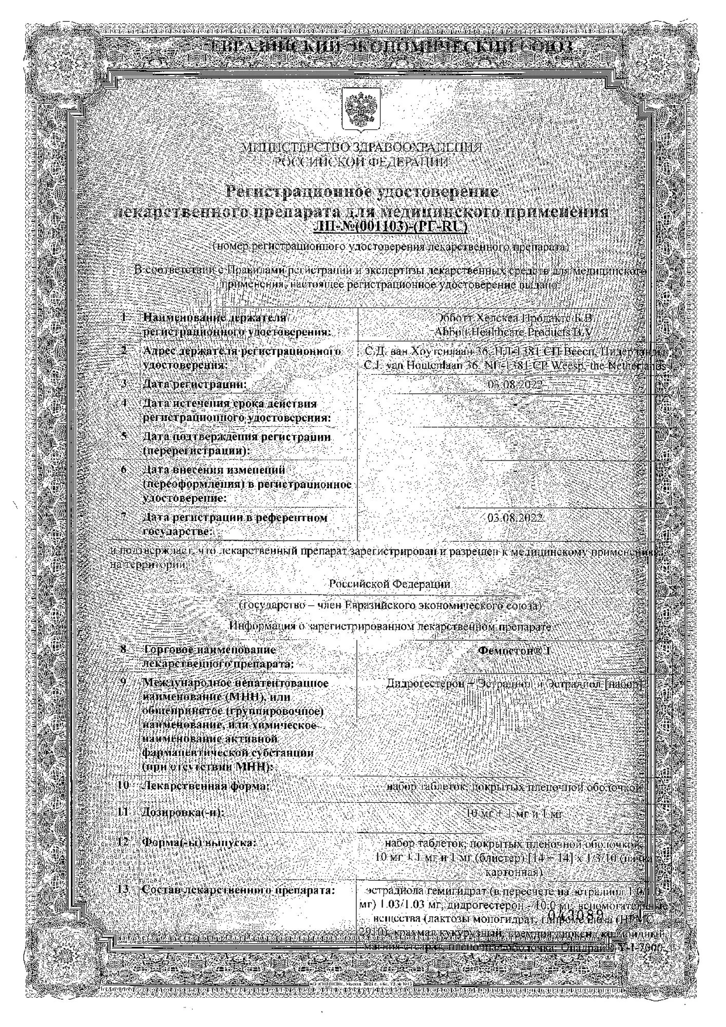 Действующие вещества: эстрадиола гемигидрат - 1,03 мг (в пересчете на эстрадиол - 1,0 мг) и дидрогестерон 10 мг;