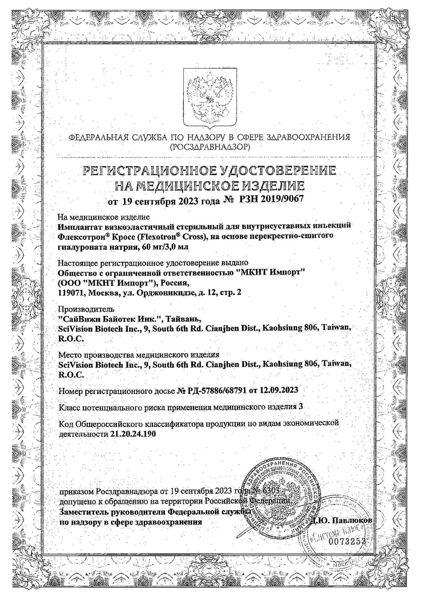 Имплантат вязкоэластичный стерильный для внутрисуставных инъекций Флексотрон ® Кросс, на основе перекрестно-сшитого гиалуроната натрия, 60 мг/3,0 мл, в стеклянных шприцах.