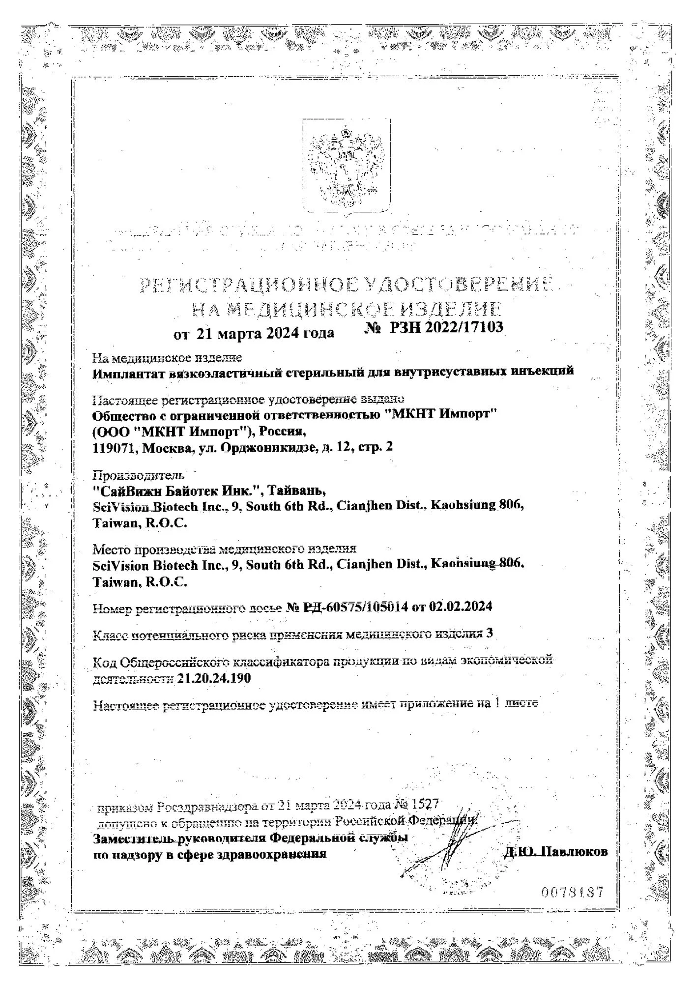 1 мл натрия гиалуронат 22 мг вязкость имплантата при нулевой скорости сдвига >50000 mПа·с осмоляльность 270-400 мОсмоль/кг pH 6.8-7.4 Вспомогательные вещества (солевой раствор фосфатного буфера):натрия гидрофосфата дигидрат (Na2HPO4×2H2O) - 0.563 мг, натрия дигидрофосфата дигидрат (NaH2PO4×2H2O) - 0.045 мг, натрия хлорид - 8.5 мг, вода д/и - до 1 мл.