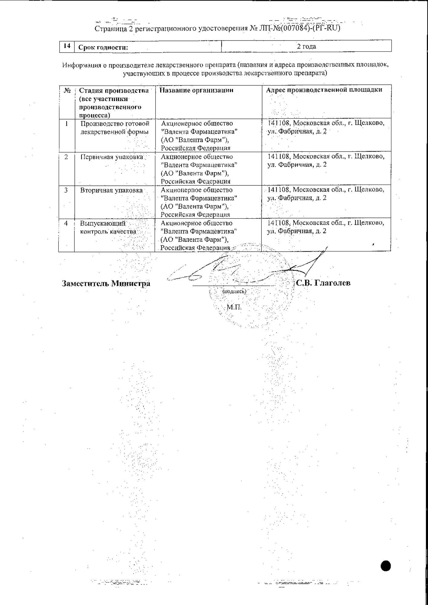 ОАО «Валента Фармацевтика». 141101, Московская обл., г. Щелково, ул. Фабричная, 2.