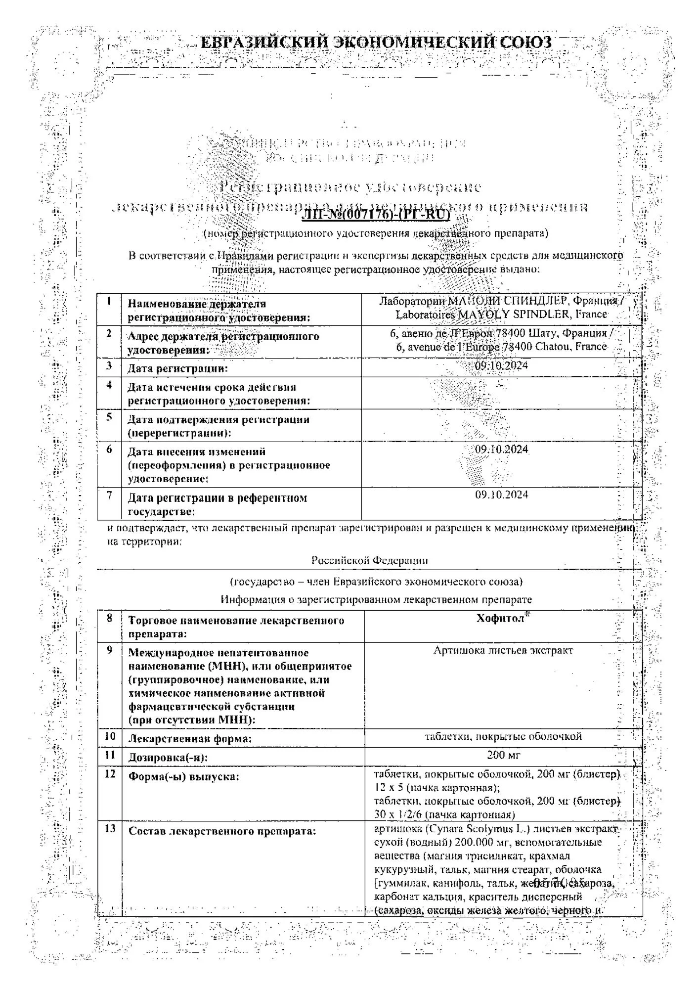 | сухой водный экстракт свежих листьев артишока полевого | 200 мг |