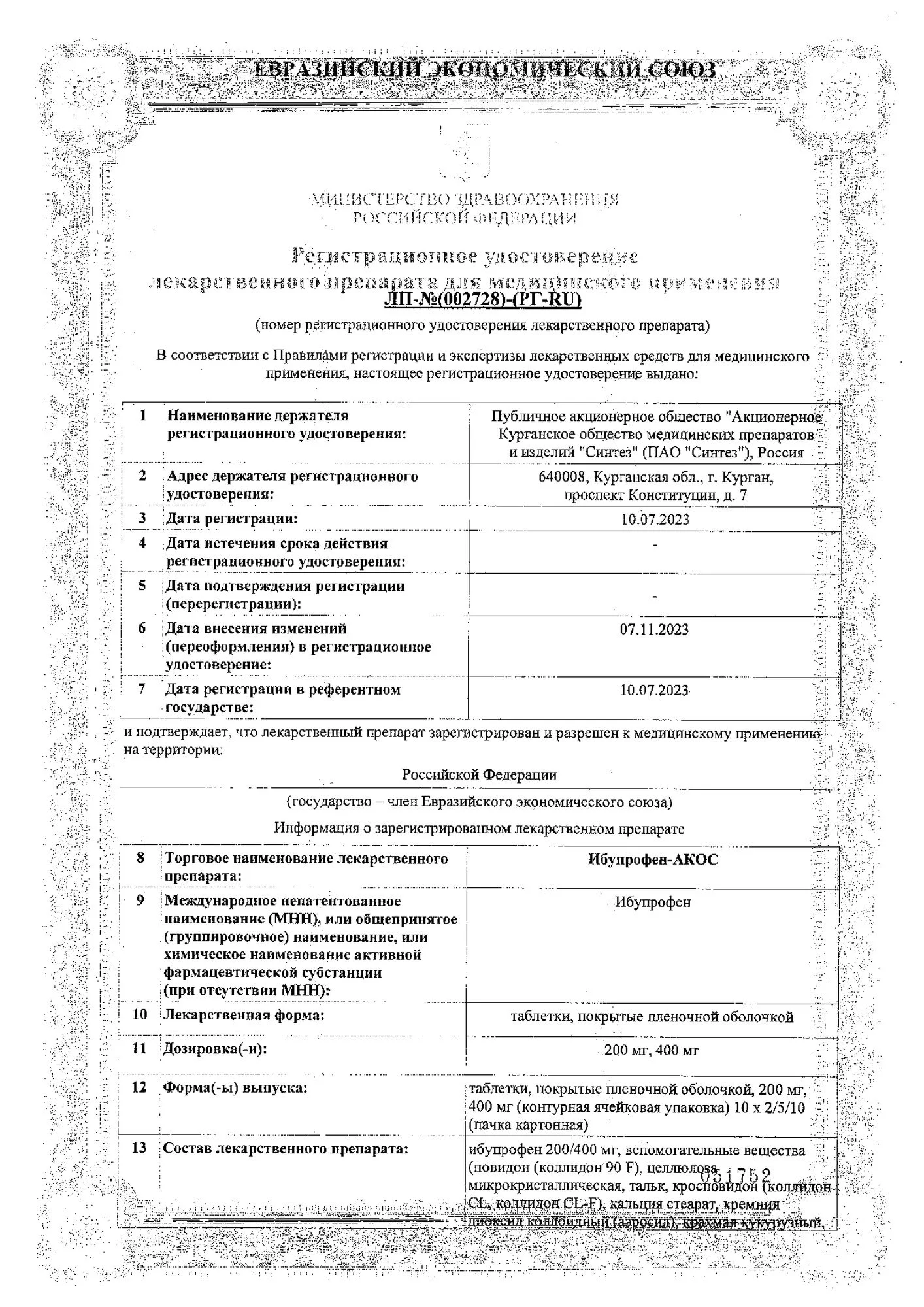 Ибупрофен Акос, таблетки ппо 400мг №50