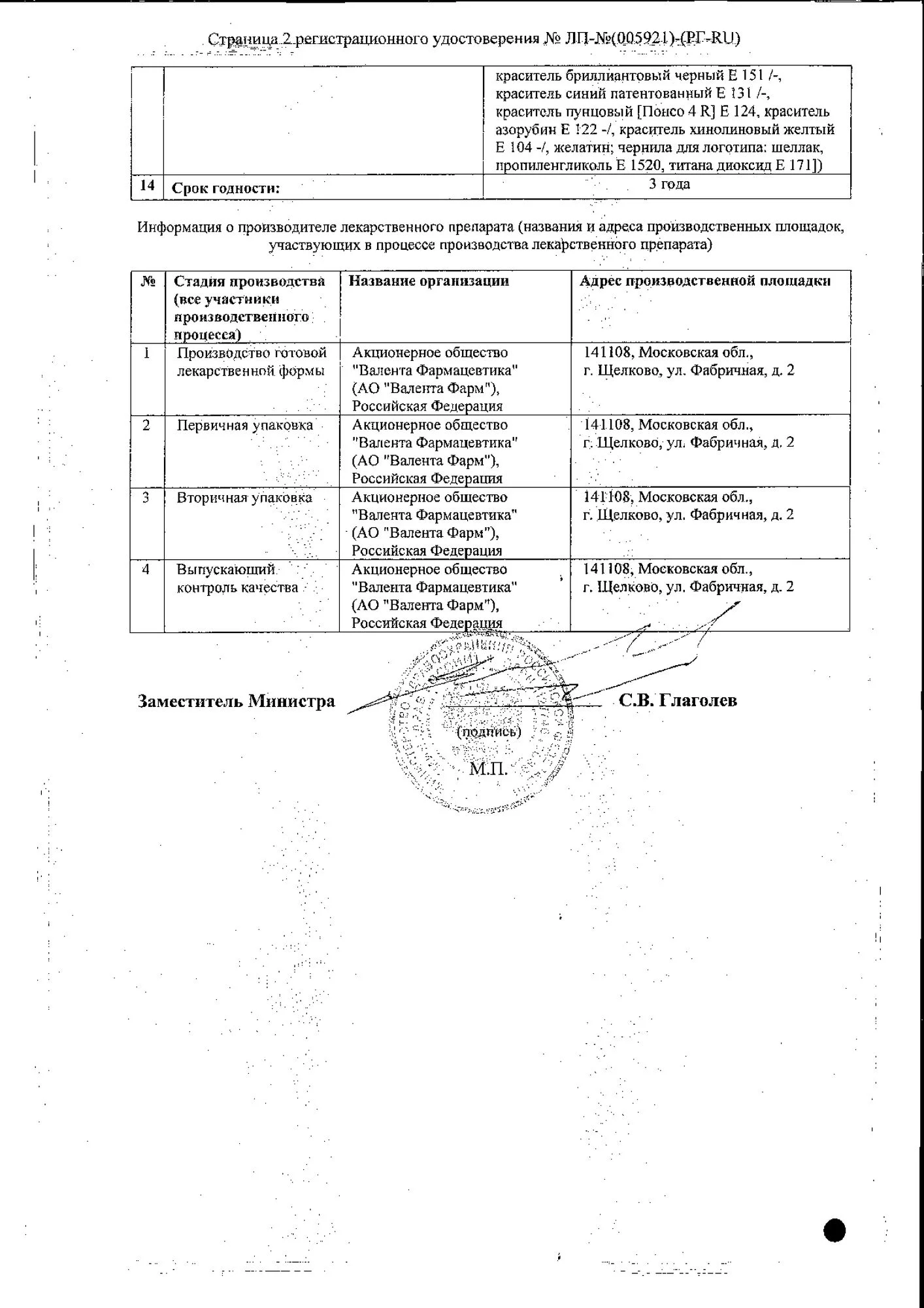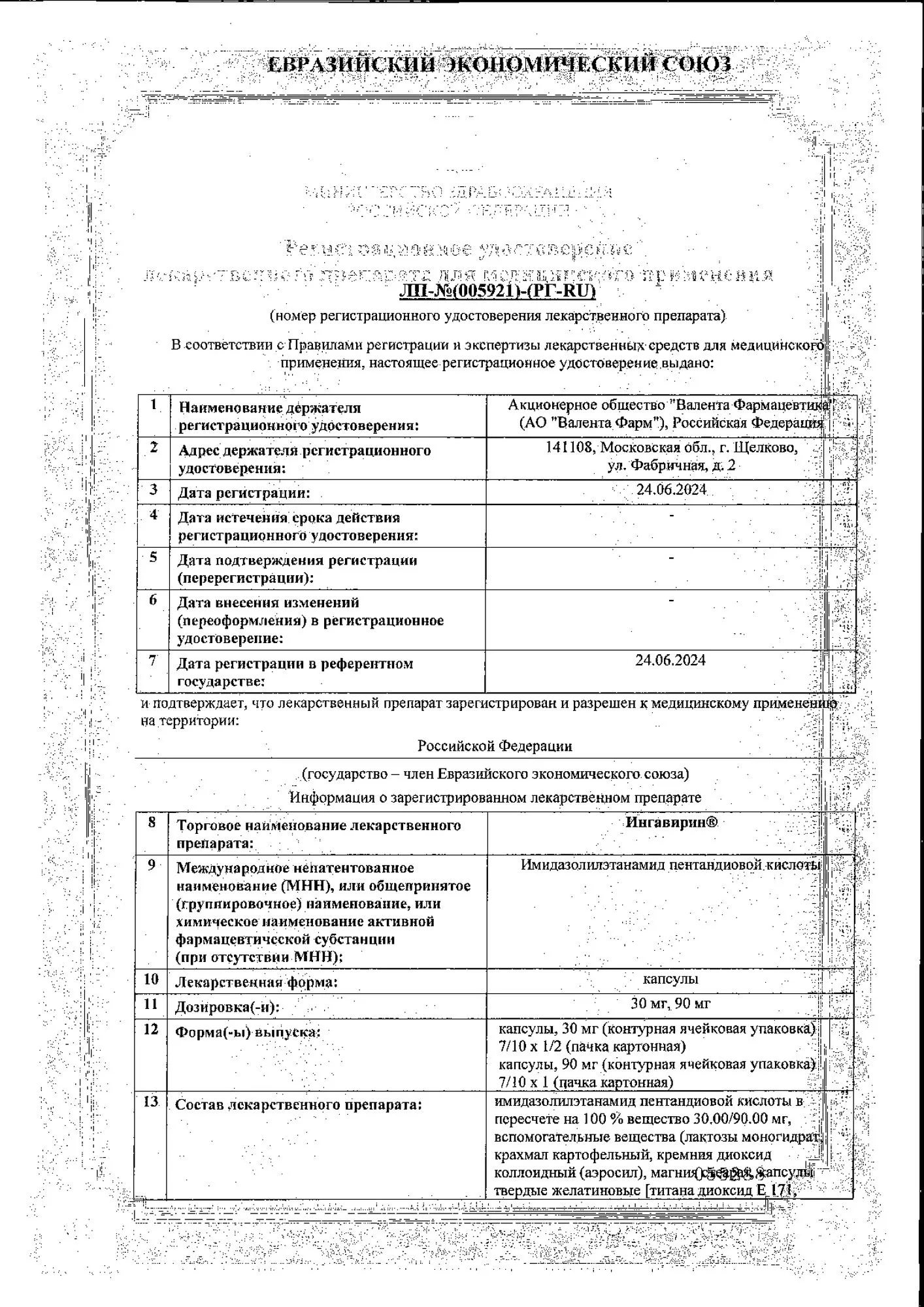 Одна капсула содержит: действующее вещество: имидазолилэтанамид пентандиовой кислоты (витаглутам) в пересчете на 100 % вещество - 30,00 мг или 90,00 мг; вспомогательные вещества: лактозы моногидрат, крахмал картофельный, кремния диоксид коллоидный (аэросил), магния стеарат; капсулы твердые желатиновые: для дозировки 30 мг - титана диоксид Е 171, краситель бриллиантовый черный Е 151, краситель синий патентованный Е 131, краситель пунцовый [Понсо 4 R] Е 124, краситель азорубин Е 122, желатин; для дозировки 90 мг - титана диоксид Е 171, краситель пунцовый [Понсо 4 R] Е 124, краситель азорубин Е 122, краситель хинолиновый желтый Е 104, желатин; состав чернил для логотипа: шеллак, пропиленгликоль Е 1520, титана диоксид Е 171