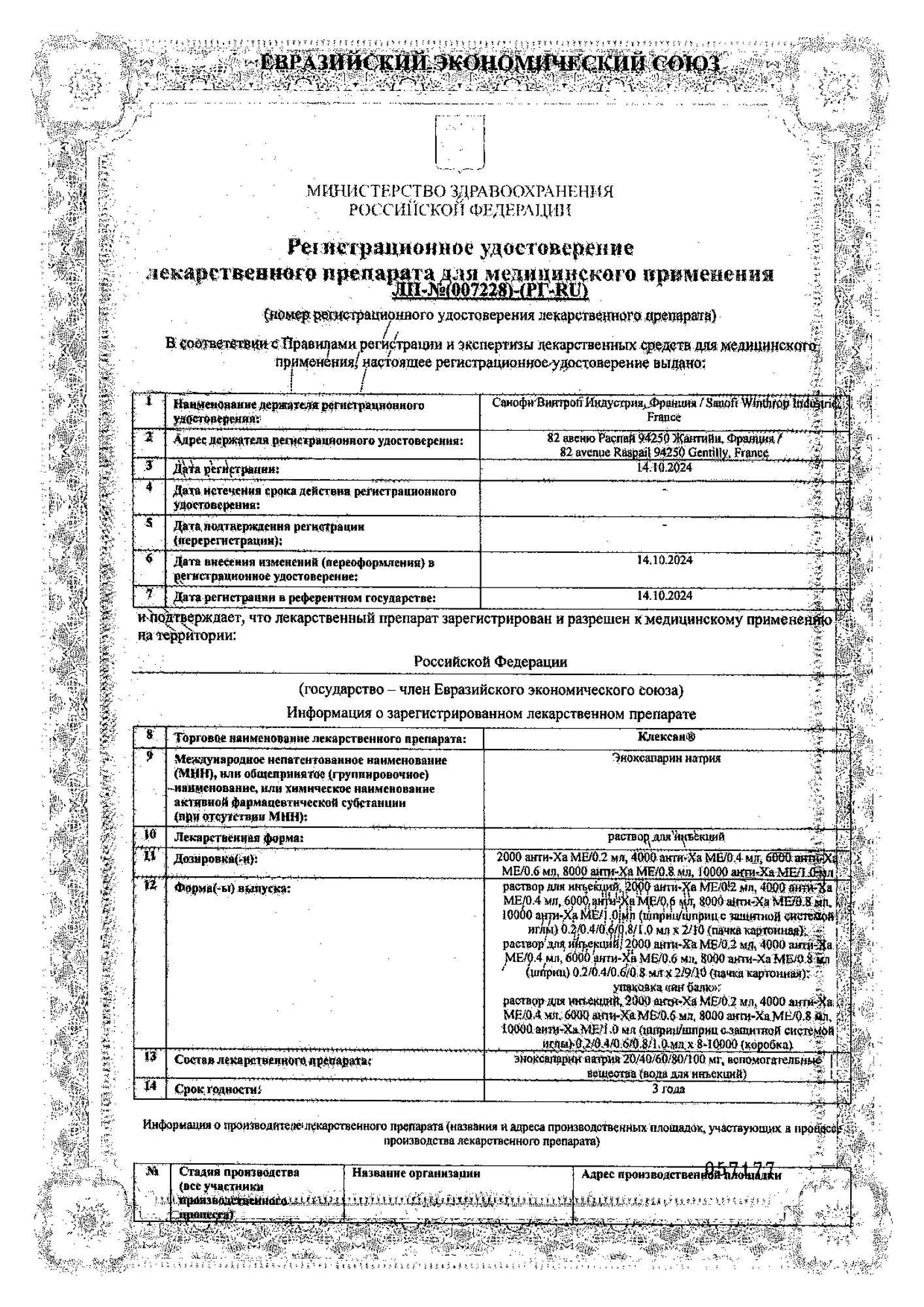 Состав на один шприц: Активное вещество: эноксапарин натрия 40 мг*; Растворитель: вода для инъекций до 0,4 мл; * - масса рассчитана на основании содержания используемого эноксапарина натрия (теоретическая активность 100 анти-Ха МЕ/мг).