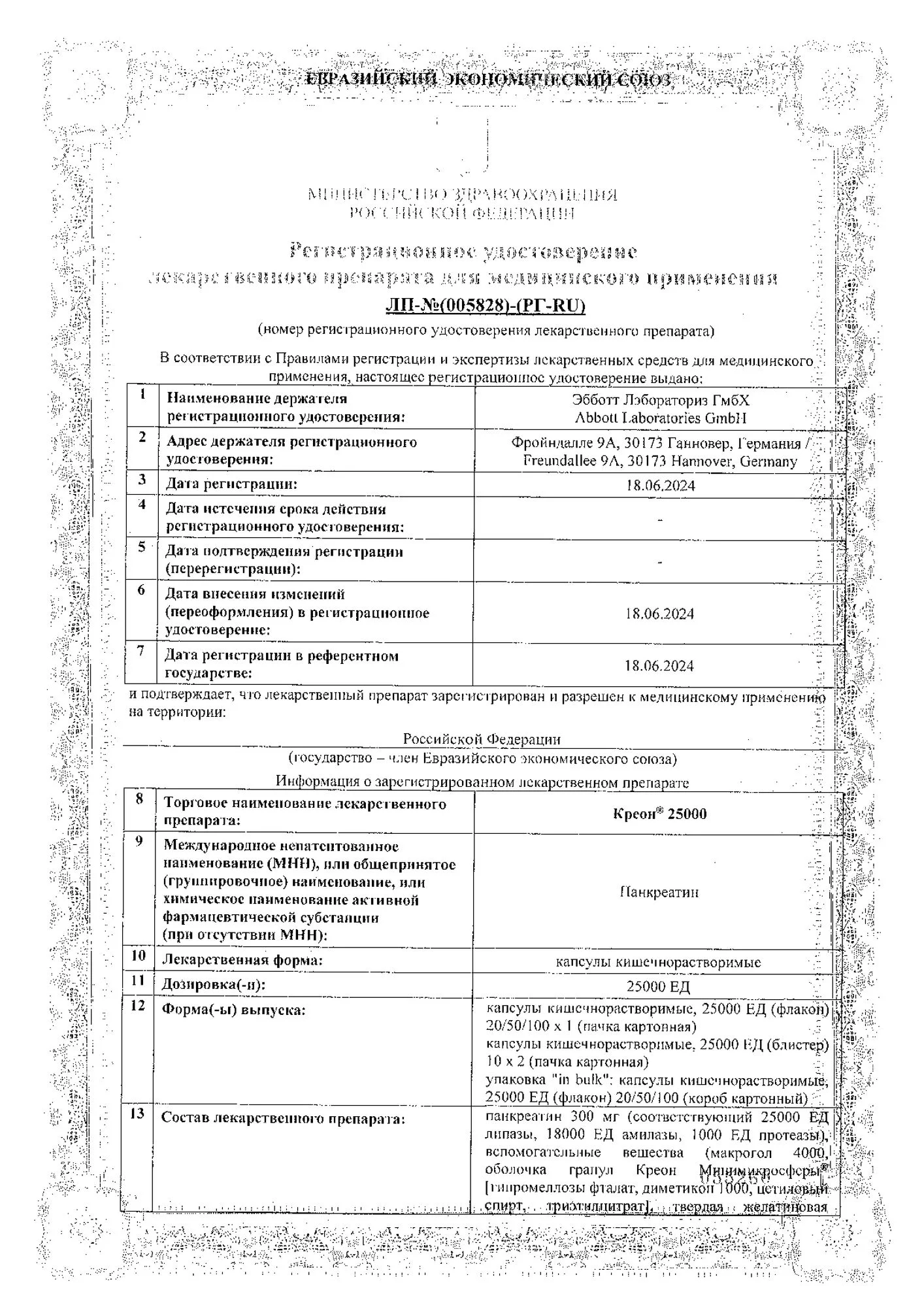 Креон® 25000 содержит свиной панкреатин в форме минимикросфер, покрытых кишечнорастворимой (кислотоустойчивой) оболочкой, в желатиновых капсулах. Капсулы быстро растворяются в желудке, высвобождая сотни минимикросфер. Данный принцип разработан с целью одновременного пассажа (поступления) минимикросфер с пищей из желудка в кишечник и тщательного перемешивания минимикросфер с кишечным содержимым, и, в конечном счете, лучшего распределения ферментов после их высвобождения внутри содержимого кишечника.