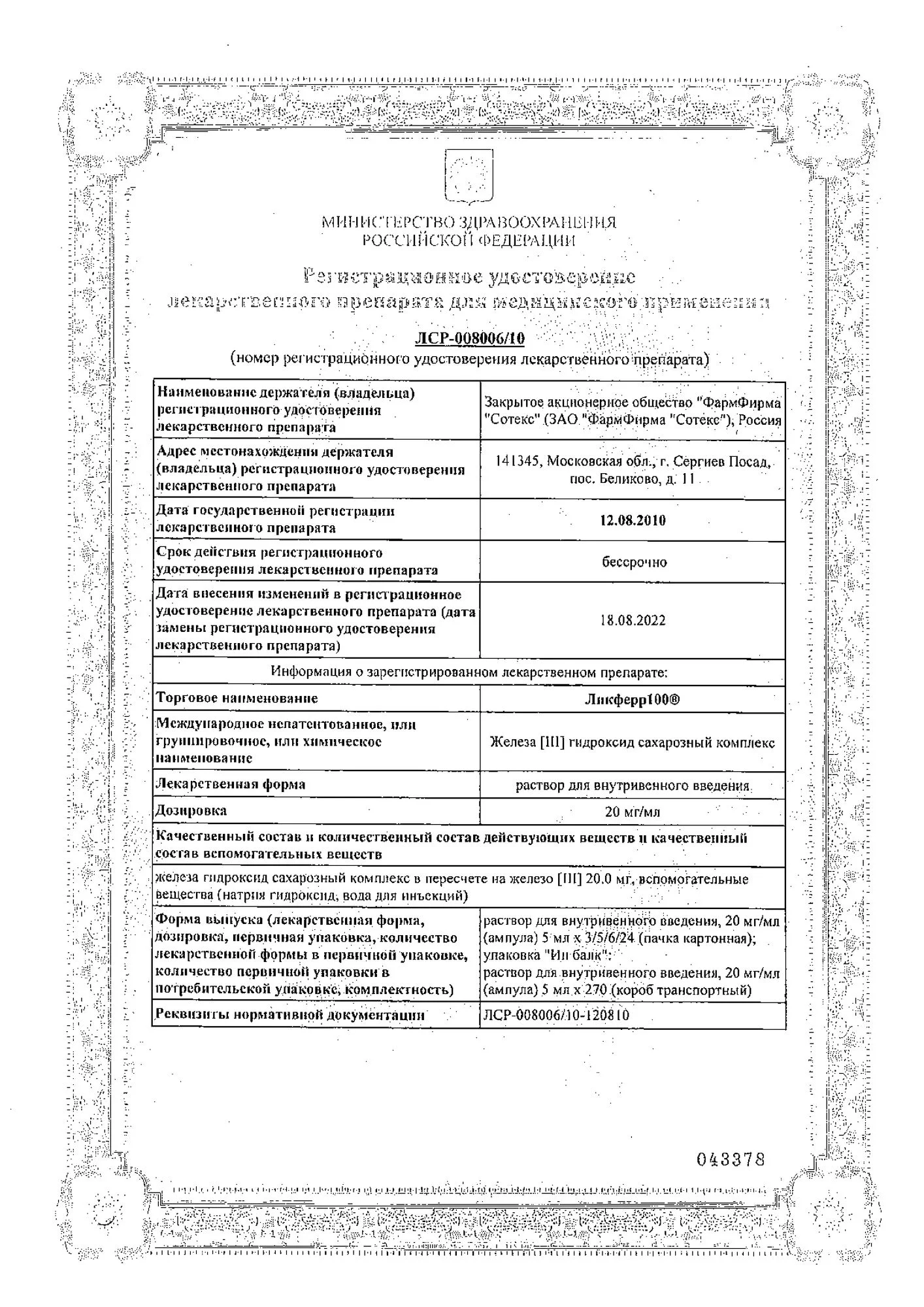Для струйного введения: 10 мл препарата Ликферр100® (200 мг железа), продолжительность введения — не менее 10 мин.