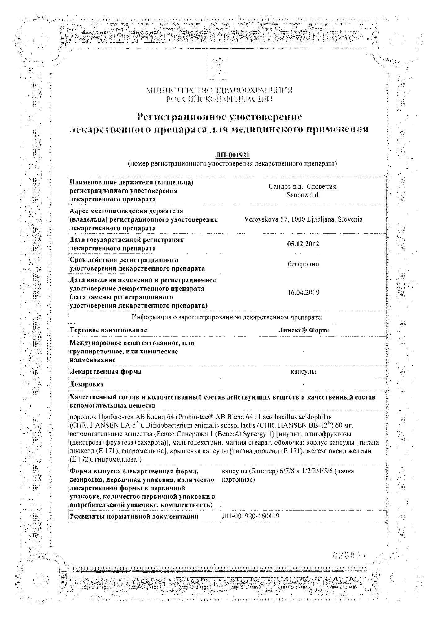 Одна капсула препарата Линекс® Форте содержит молочнокислые бактерии (Lactobacillus acidophilus (LA-5) и Bifidobacterium animalis subsp. lactis (BB-12)), каждая капсула содержит 109 колониеобразующих единиц живых лиофилизированных молочнокислых бактерий. Живые молочнокислые бактерии являются нормальной составляющей естественной микрофлоры кишечника.
