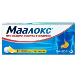 Таблетки жевательные [без сахара]: таблетки от белого до желтоватого цвета с незначительной мраморностью, круглые, плоскоцилиндрической формы с фаской, с гравировкой "MAALOX" на одной стороне и "sans sucre" на другой, с запахом лимона.