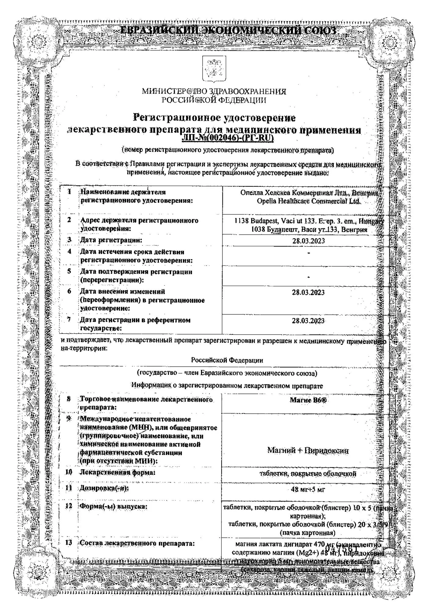 действующие вещества: магния лактата дигидрат* - 470 мг; пиридоксина гидрохлорид - 5 мг; вспомогательные вещества: сахароза - 115,6 мг, каолин тяжелый - 40,0 мг, акации камедь - 20,0 мг, карбоксиполиметилен 934 - 10,0 мг, тальк (магния гидросиликат) - 42,7 мг, магния стеарат - 6,7 мг.