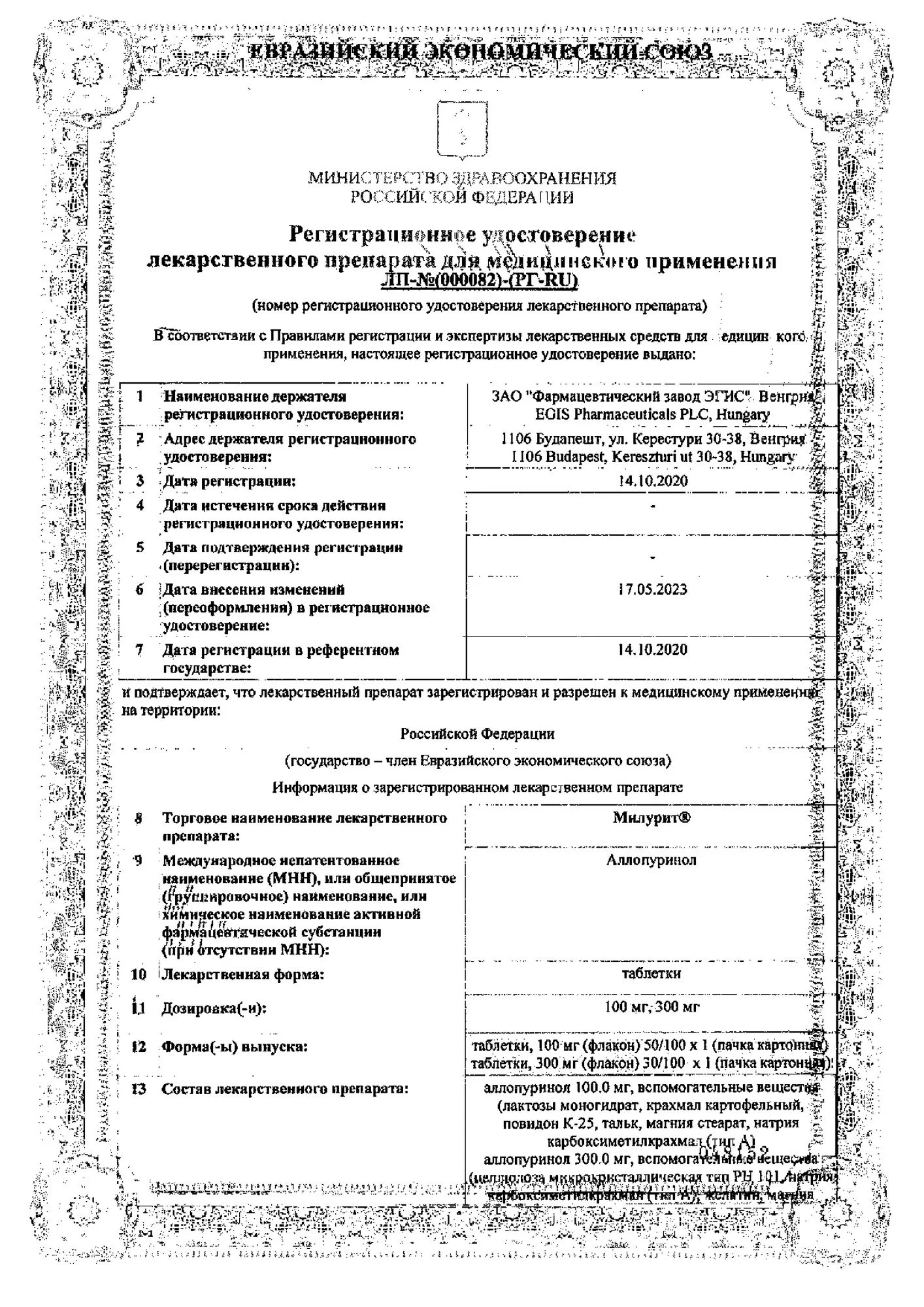 Нечастые: реакции гиперчувствительности; тяжелые реакции гиперчувствительности, включая кожные реакции с отслойкой эпидермиса, лихорадкой, лимфаденопатией, артралгией и (или) эозинофилией (в том числе синдром Стивенса-Джонсона (ССД) и токсический эпидермальный некролиз (ТЭН)) (см. раздел «Нарушения со стороны кожи и подкожных тканей»). Сопутствующий васкулит или реакции со стороны ткани могут иметь различные проявления, включая гепатит, поражение почек, острый холангит, ксантиновые конкременты и, в очень редких случаях, судороги. Кроме того, очень редко наблюдалось развитие анафилактического шока. При развитии тяжелых нежелательных реакций терапию аллопуринолом необходимо немедленно прекратить и не возобновлять. При отсроченной мультиорганной гиперчувствительности (известной как синдром лекарственной гиперчувствительности могут развиваться следующие симптомы в различных комбинациях: лихорадка, кожная сыпь, васкулит, лимфаденопатия, псевдолимфома, артралгия, лейкопения, эозинофилия, гепато-спленомегалия, изменение результатов печеночных функциональных тестов, синдром исчезающих желчных протоков (разрушение или исчезновение внутрипеченочных желчных протоков). Могут быть затронуты другие органы (например, печень, легкие, почки, поджелудочная железа, миокард и толстый кишечник). При развитии таких реакций в любой период лечения, Милурит следует немедленно отменить и никогда не возобновлять. Повторно начинать прием препарата пациентами с синдромом гиперчувствительности и ССД/ТЭН не следует. Кортикостероиды могут быть полезны при лечении реакций гиперчувствительности со стороны кожи.