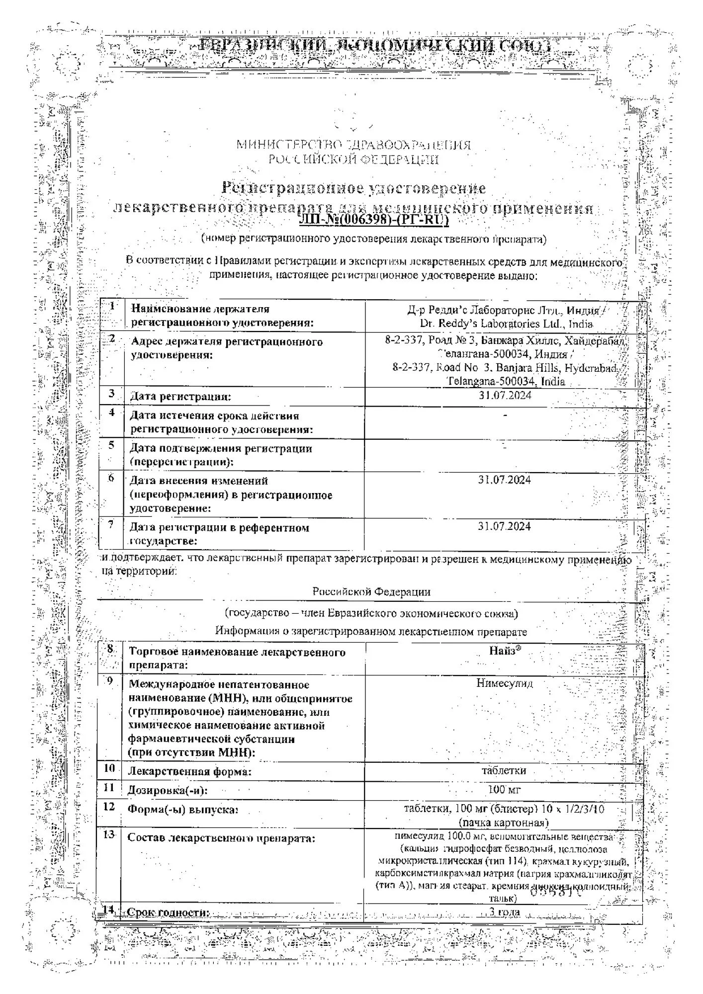 Поскольку Найз частично выводится почками, его дозу для пациентов с нарушениями функции почек следует уменьшать, в зависимости от показателей клиренса креатинина. Учитывая сообщения о нарушениях зрения у пациентов, принимавших другие НПВП, лечение должно быть немедленно прекращено, если появляется любое нарушение зрения, и пациента должен обследовать врач-окулист.