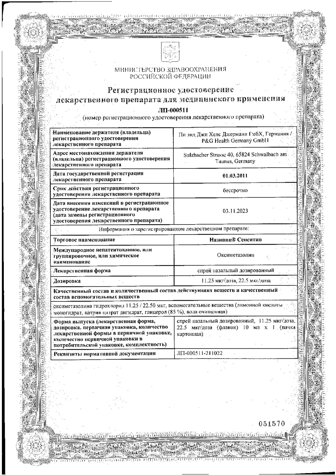 11,25 мкг оксиметазолина гидрохлорида – для Називин® Сенситив спрея назального дозированного 11,25 мкг/дозу;