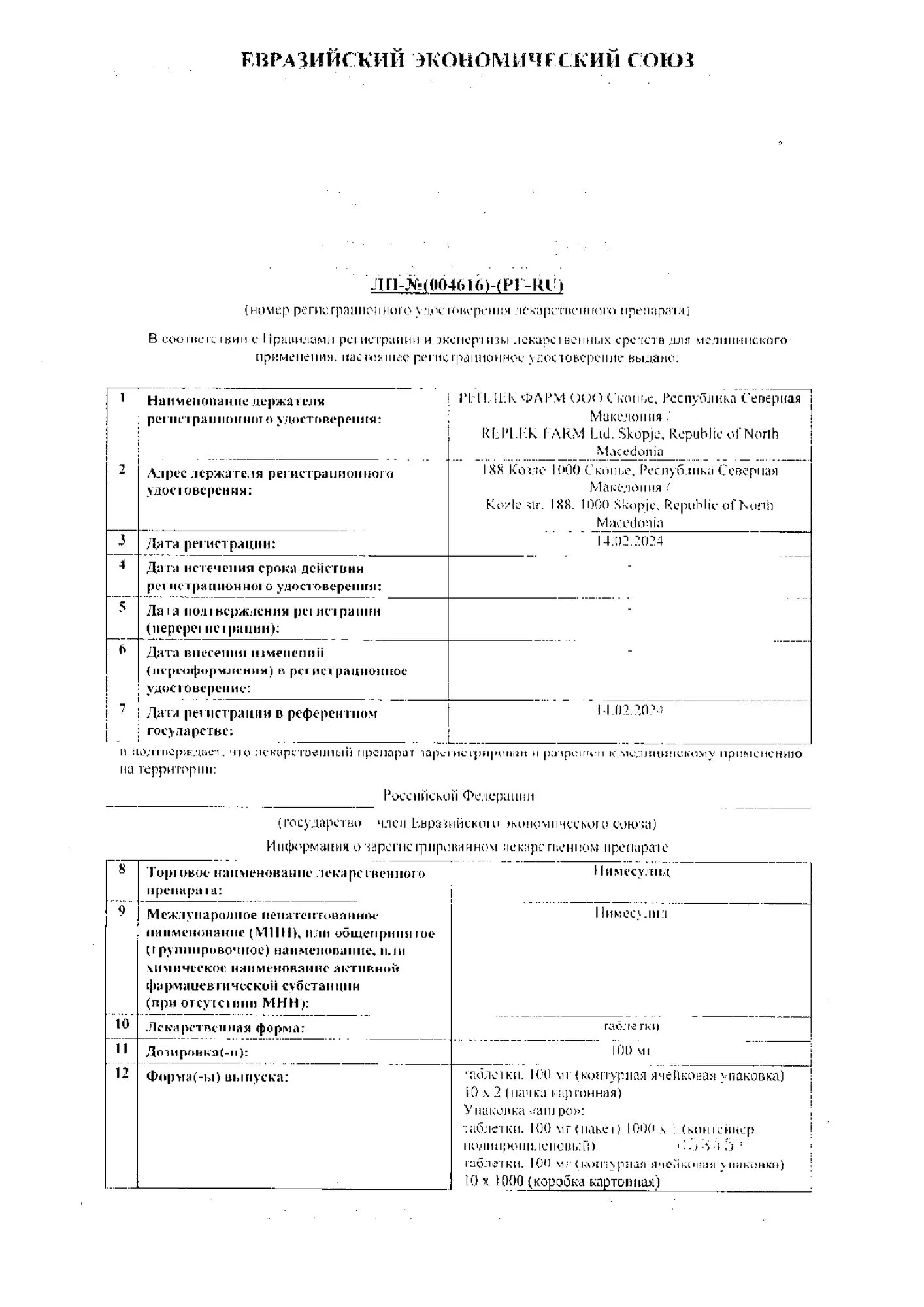 нимесулид - 100 мг;