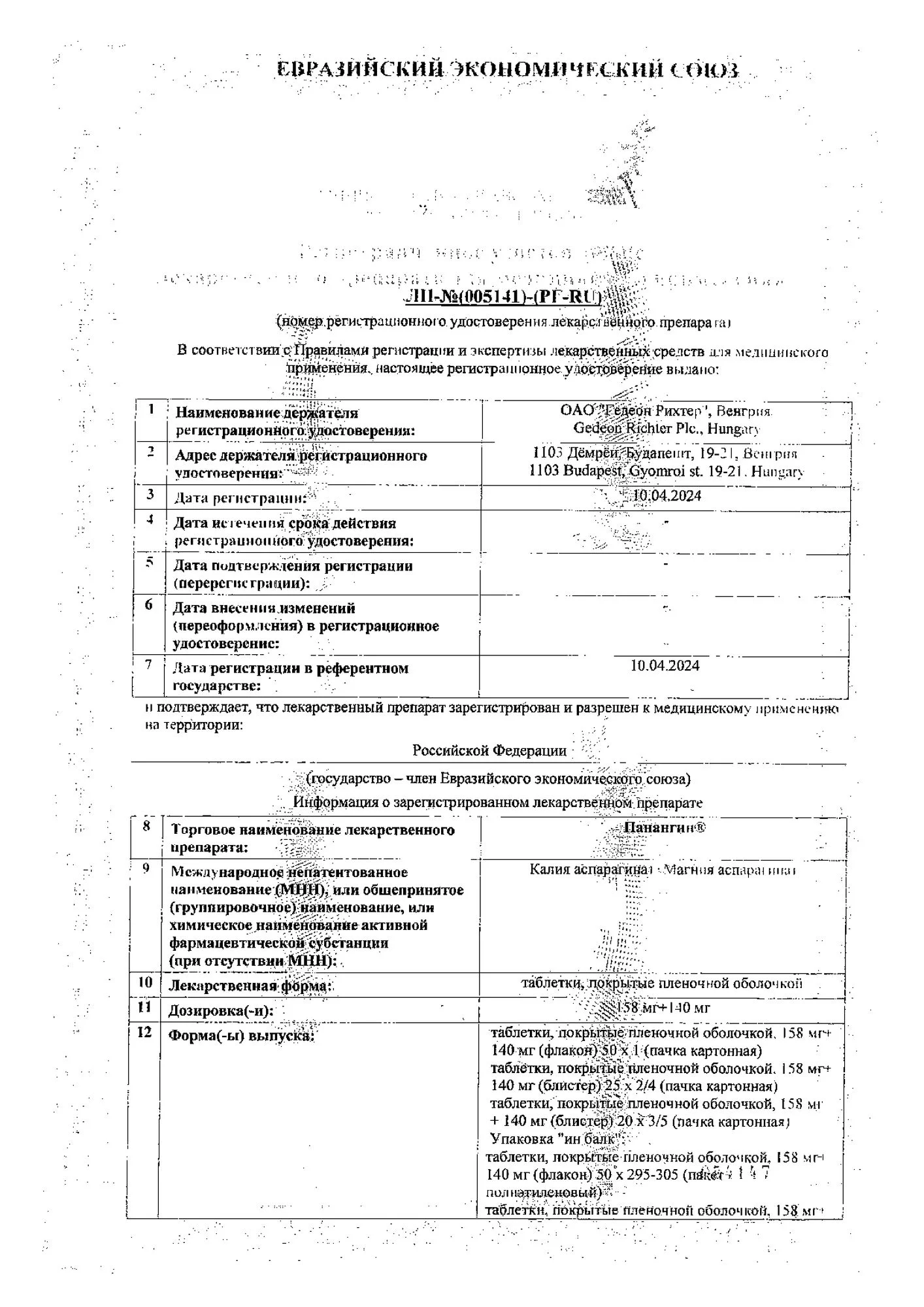 Вяжущие и обволакивающие средства уменьшают всасывание препарата в ЖКТ. Необходимо соблюдать 3-часовой интервал между приемом внутрь препарата Панангин® с вышеперечисленными средствами.