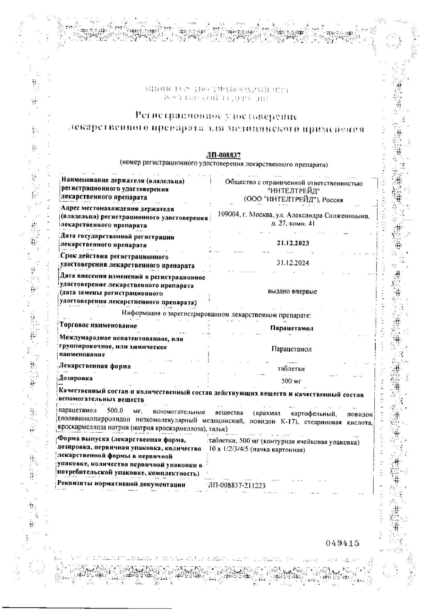 Действующее вещество: парацетамол - 500,0 мг;