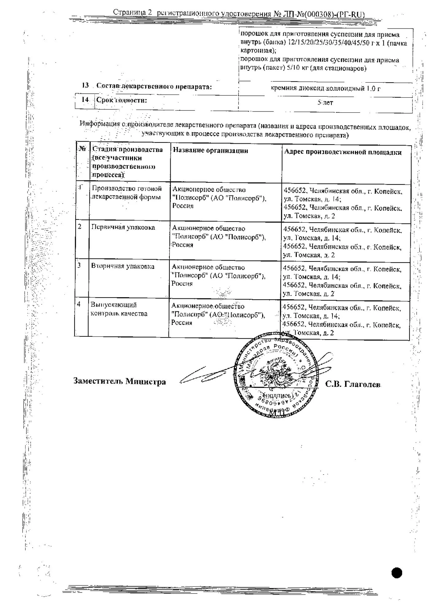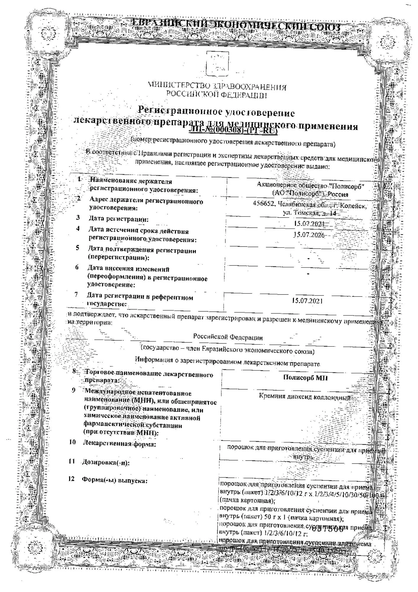 Полисорб® МП - неорганический неселективный полифункциональный энтеросорбент на основе высокодисперсного кремнезема с размерами частиц до 0.09 мм и с химической формулой SiO2.