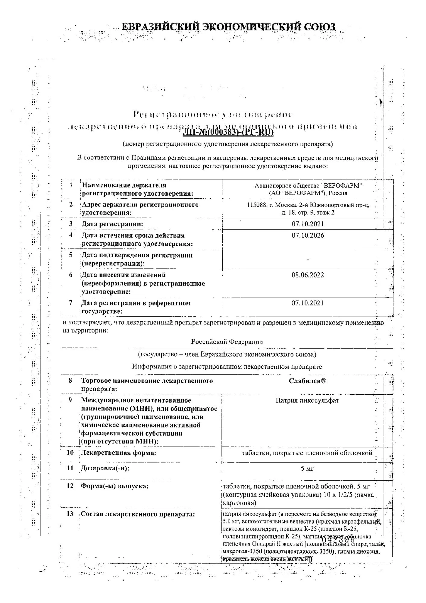 Слабилен, таблетки ппо 5мг №20