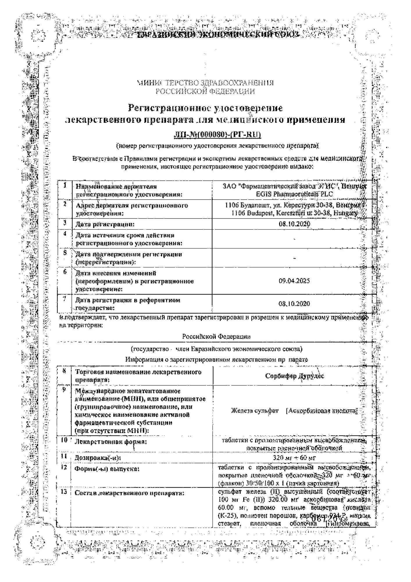 Одновременное применение препарата Сорбифер Дурулес и антацидных препаратов, содержащих гидроксид алюминия и карбонат магния, может снизить всасывание железа. Между приемом препарата Сорбифер Дурулес и любого из этих препаратов следует выдержать максимально возможный интервал времени. Рекомендуемый минимальный интервал времени между приемами составляет 2 ч, кроме случаев приема тетрациклинов, когда минимальный интервал должен составлять 3 ч.