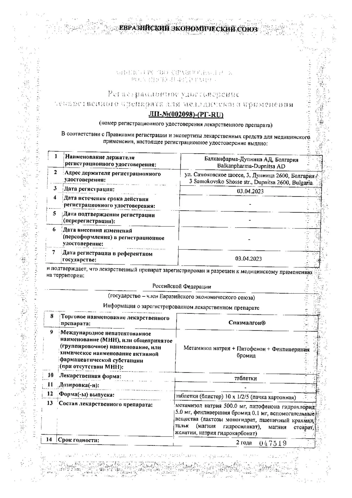метамизол натрия 500 мг, питофенона гидрохлорид 5 мг, фенпивериния бромид 0,1 мг