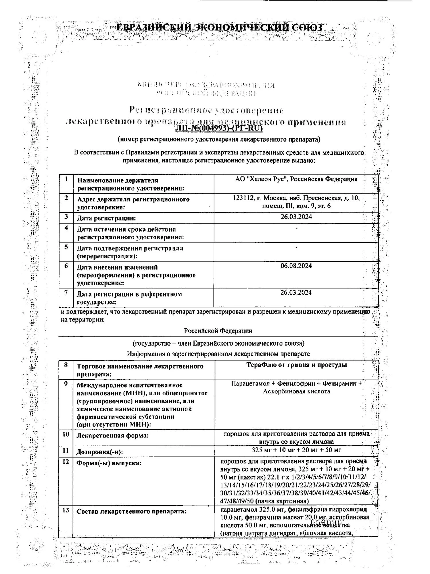 ** Инструкция по медицинскому применению препарата ТераФлю от гриппа и простуды РУ П N012063/01 от 31.05.2011
