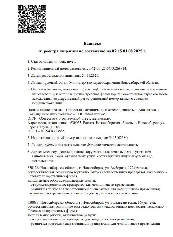 Лицензия на осуществление фармацевтической деятельности: Л042-01125-54/00269824